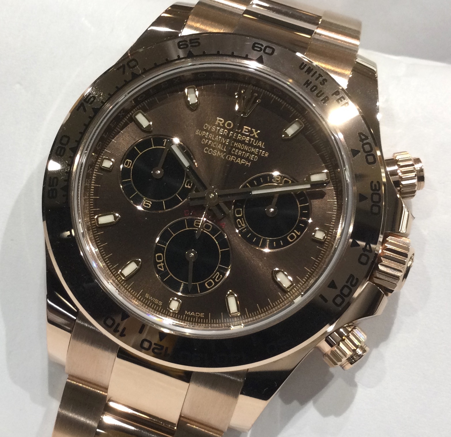 ロレックス独自配合の腐蝕に強いローズゴールドで、文字盤1番人気カラーのチョコ×黒目文字盤が美しい一本です。