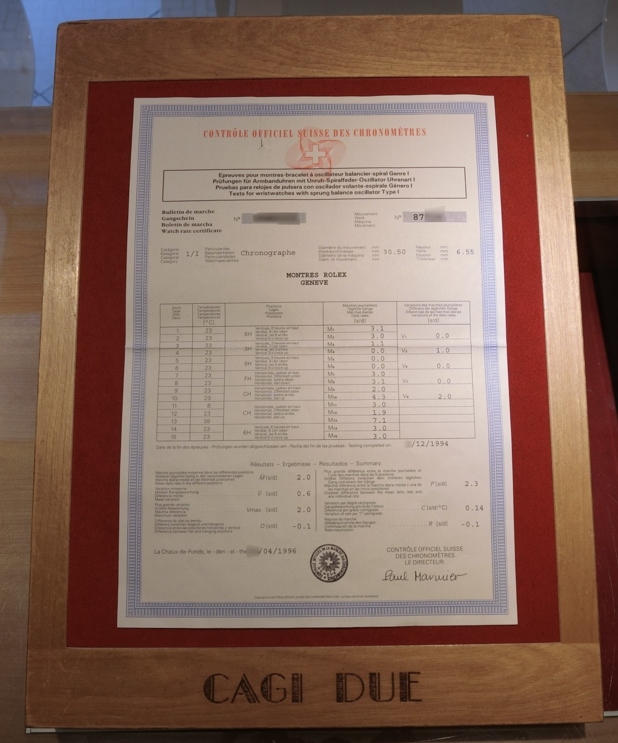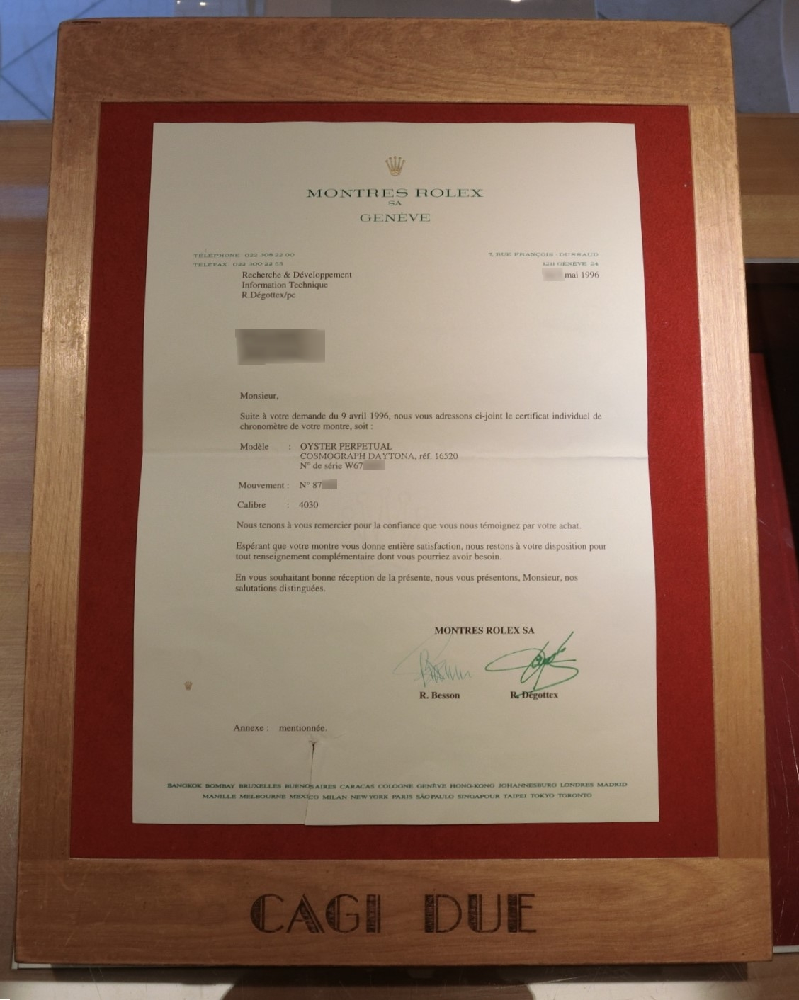 この個体にはCOSCおよびロレックス・ジュネーブ本社の技術部門から発行された、クロノメーター証明書発行レター(1996年5月)が付属。