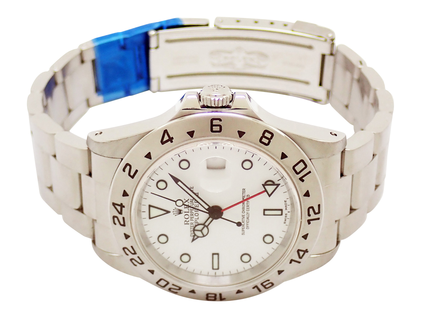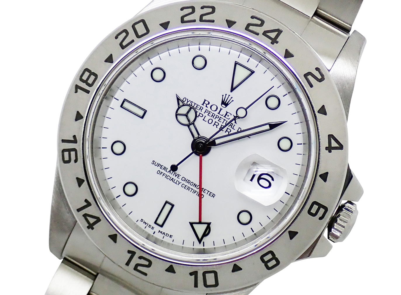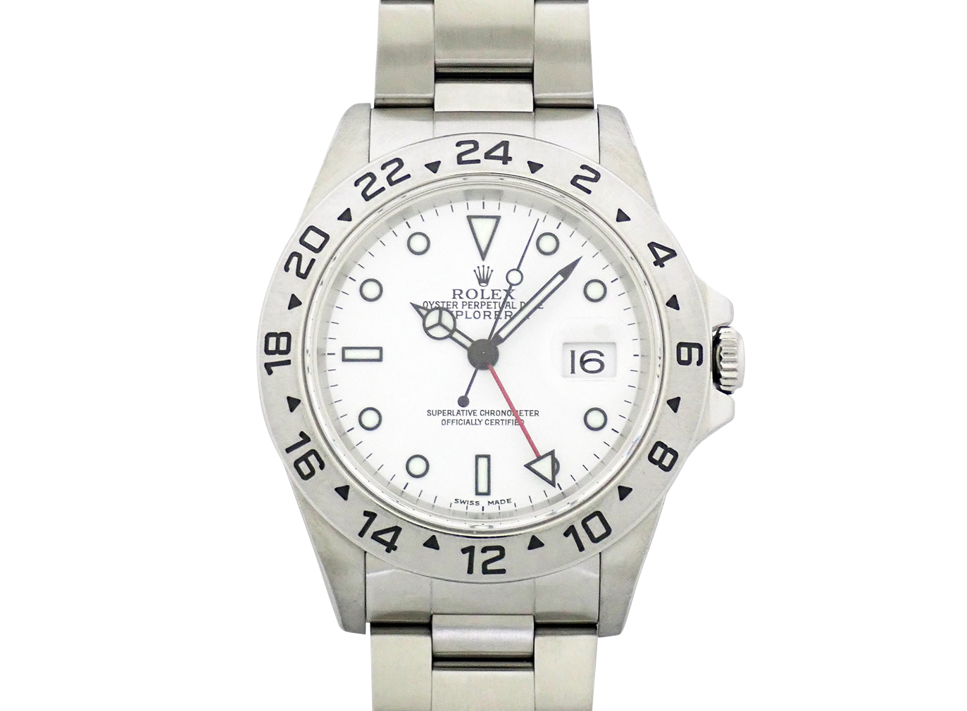 エクスプローラー2は日付表示、24時間針、24時間ベゼル、リューズガードなどを備え、エクスプローラーIからグレードアップしました。短針が単独で操作可能なGMT機能は操作もし易く機能的です。A番、白文字盤モデル。