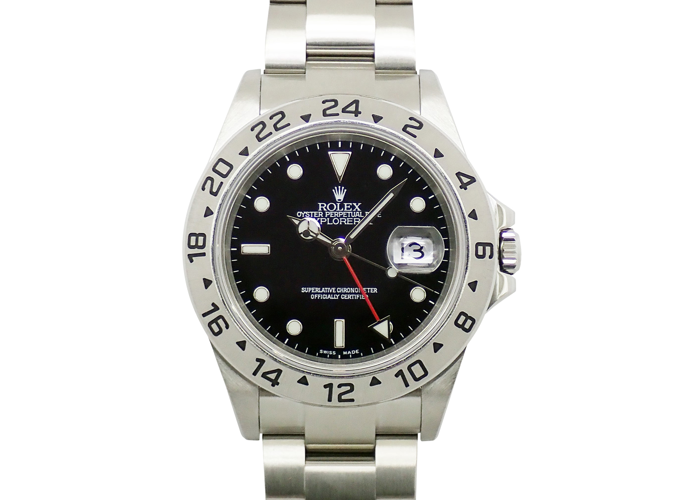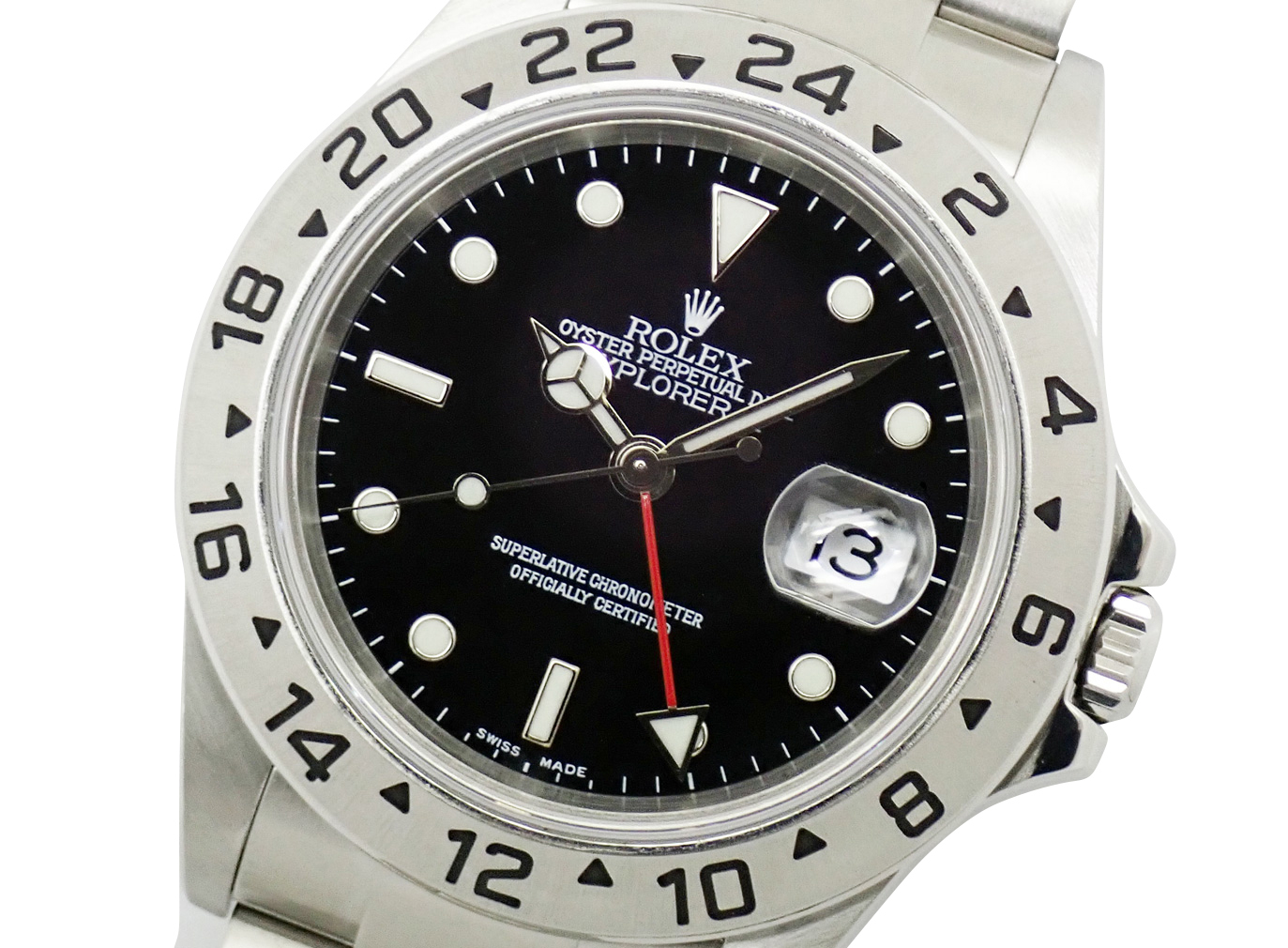 エクスプローラー2は日付表示、24時間針、24時間ベゼル、リューズガードなどを備え、エクスプローラーIからグレードアップしました。短針が単独で操作可能なGMT機能は操作もし易く機能的です。D番、ケース横穴なし、黒文字盤モデル。