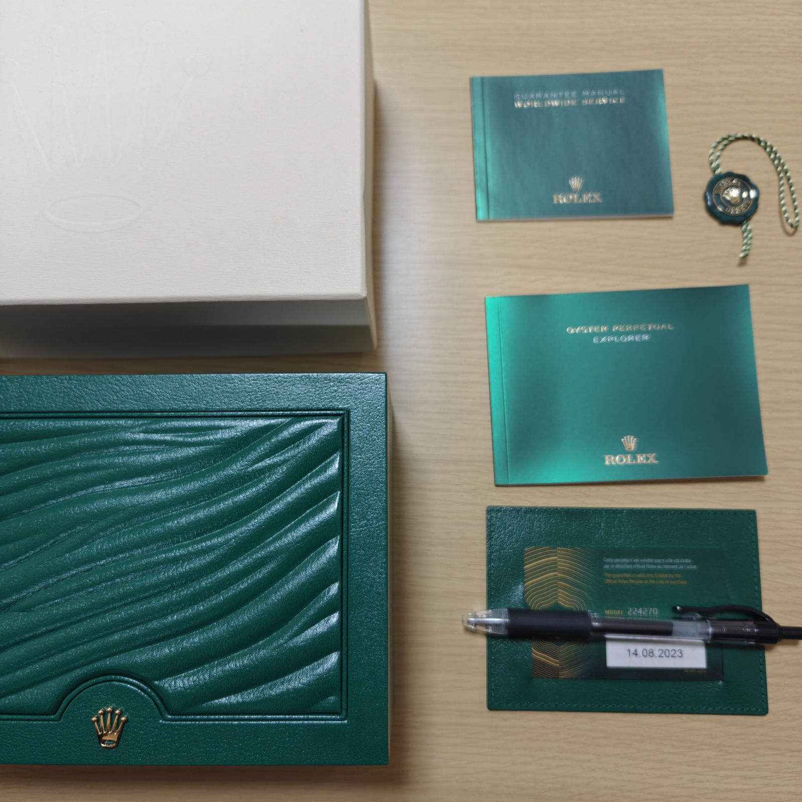 付属品は国際保証書、箱、説明書、グリーンタグになります。