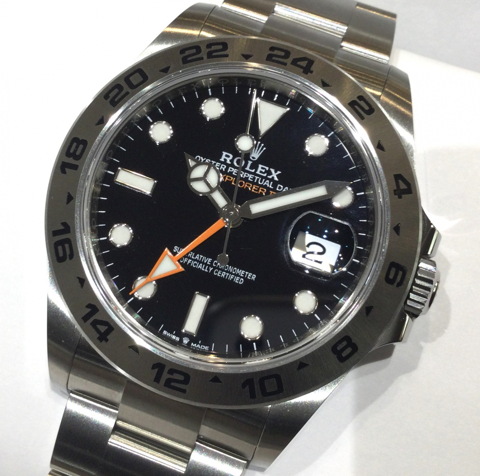 50周年を迎えたエクスプローラーII、2021年新作、EX-Ⅱ 226570 黒が入荷しました!ムーブメントがCal.3285になり70時間のロングパワーリザーブに進化。そしてコマ幅がバックルに向かって徐々に細くシャープなつくりになり、24時間針の根元がオレンジ一色となりました。是非ご検討くださいませ。