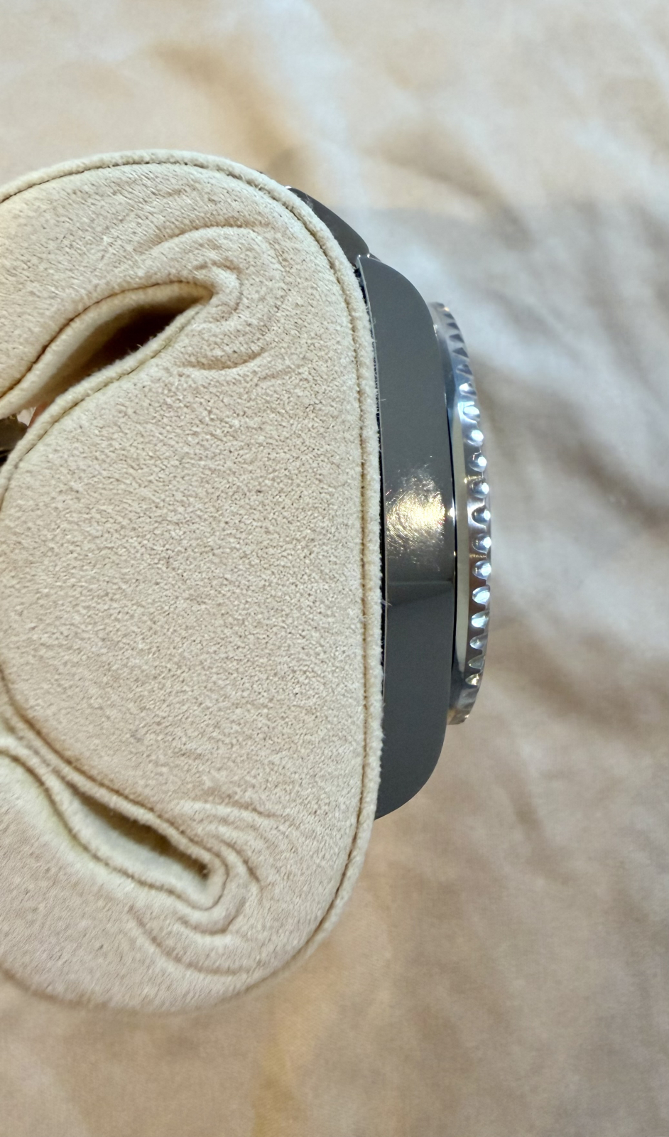 2024年までほとんど使っておらず、そこからの使用頻度は月1回程度で、かつ丁寧に使っていたので小傷はそこまで多くないかと思います。目立つ傷としては5枚目にある9時方向のスリ傷ですが、撫でてもザラつきはなくケース自体に凹みはありません(ケースサイドの傷のため使用している分には気にならないと思います)。もちろんノンポリッシュ個体になります。