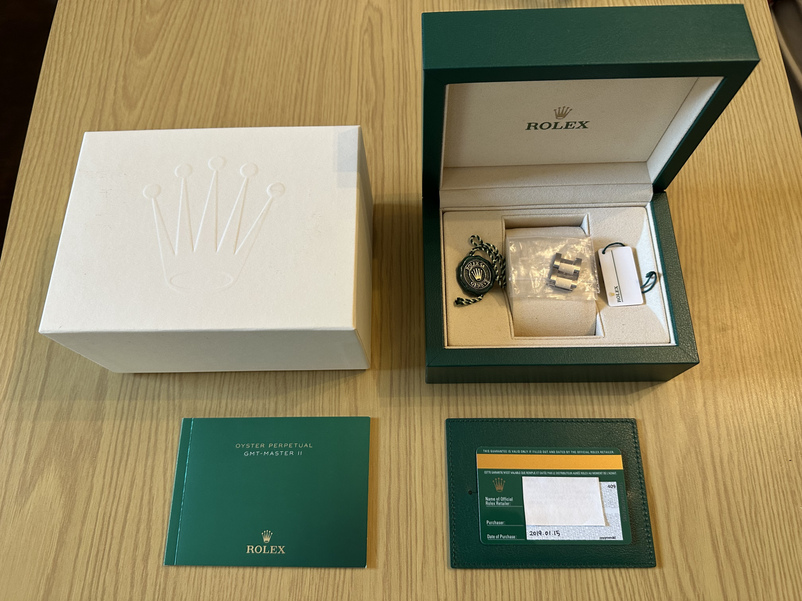 外箱/内箱、保証書(2019年1月海外)、冊子、グリーンタグ/白タグ、余りコマ(フル)