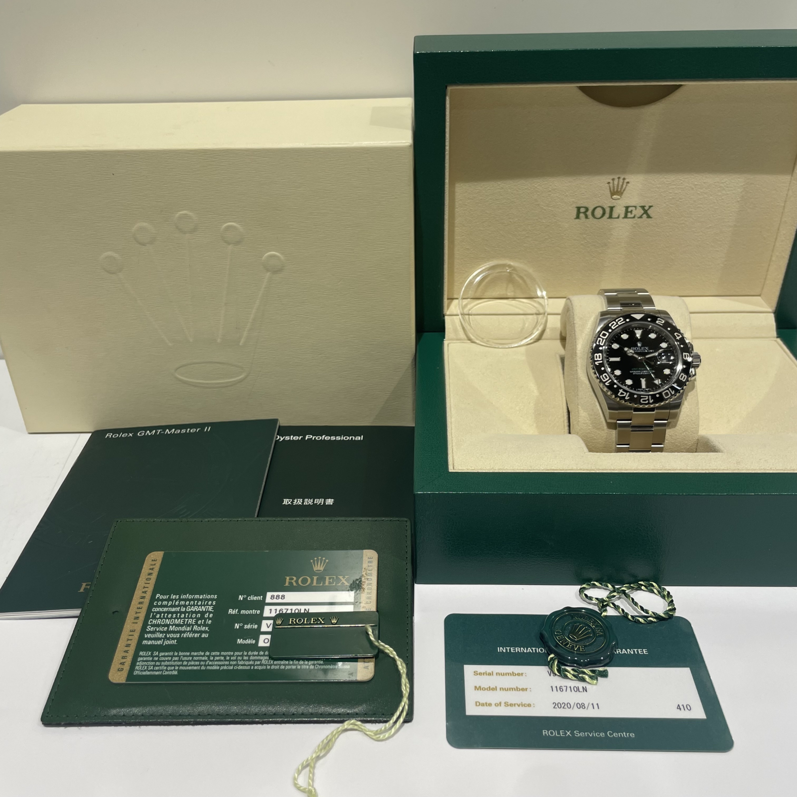 箱・保証書(並行:2011年1月印)・冊子・グリーンクロノメータータグ・ベゼルカバー・グリーンプライスタグ・国際サービス保証書(2020年)