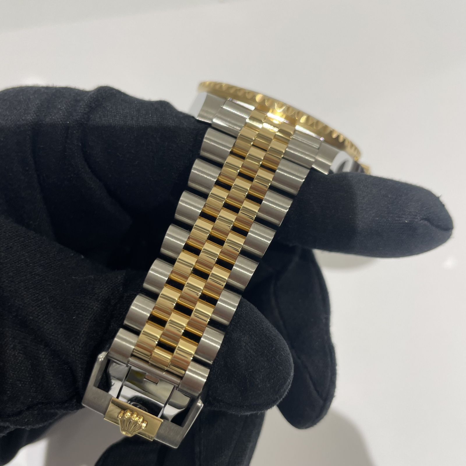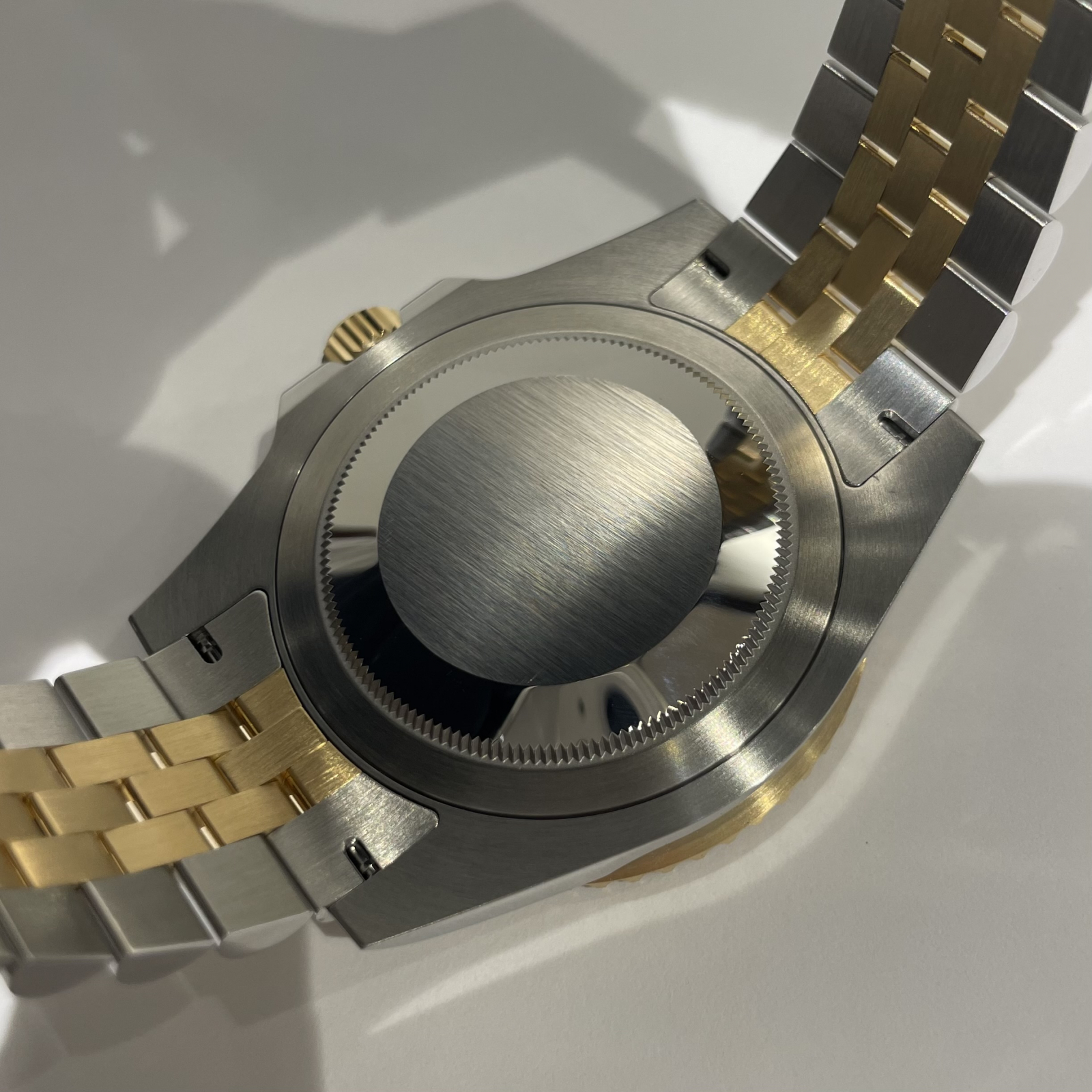 ベゼルカラーが黒とグレーの2トーンで落ち着いた印象ですが、コンビネーションモデルのため煌びやかさもございます。