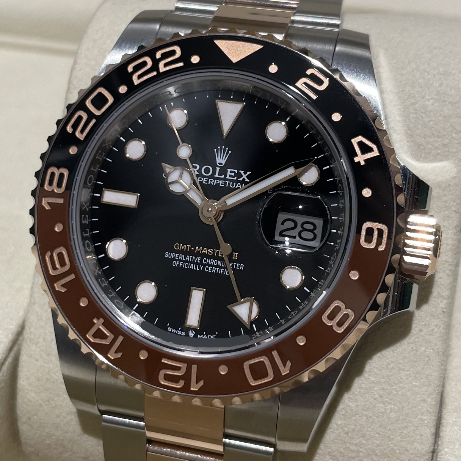 GMTマスターの中でもエレガントな雰囲気を味わえる、人気の 126711CHNR (PGコンビ)が入荷しました。ブラックとブラウンを配した2色使いのベゼルが絶妙なカラーリングの人気モデルです。高級感とスポーティーさを兼ね備えたGMTマスターを是非ご検討下さい。