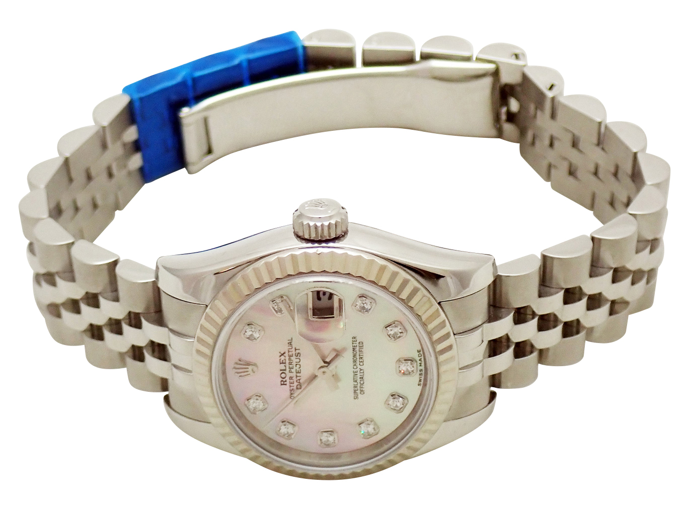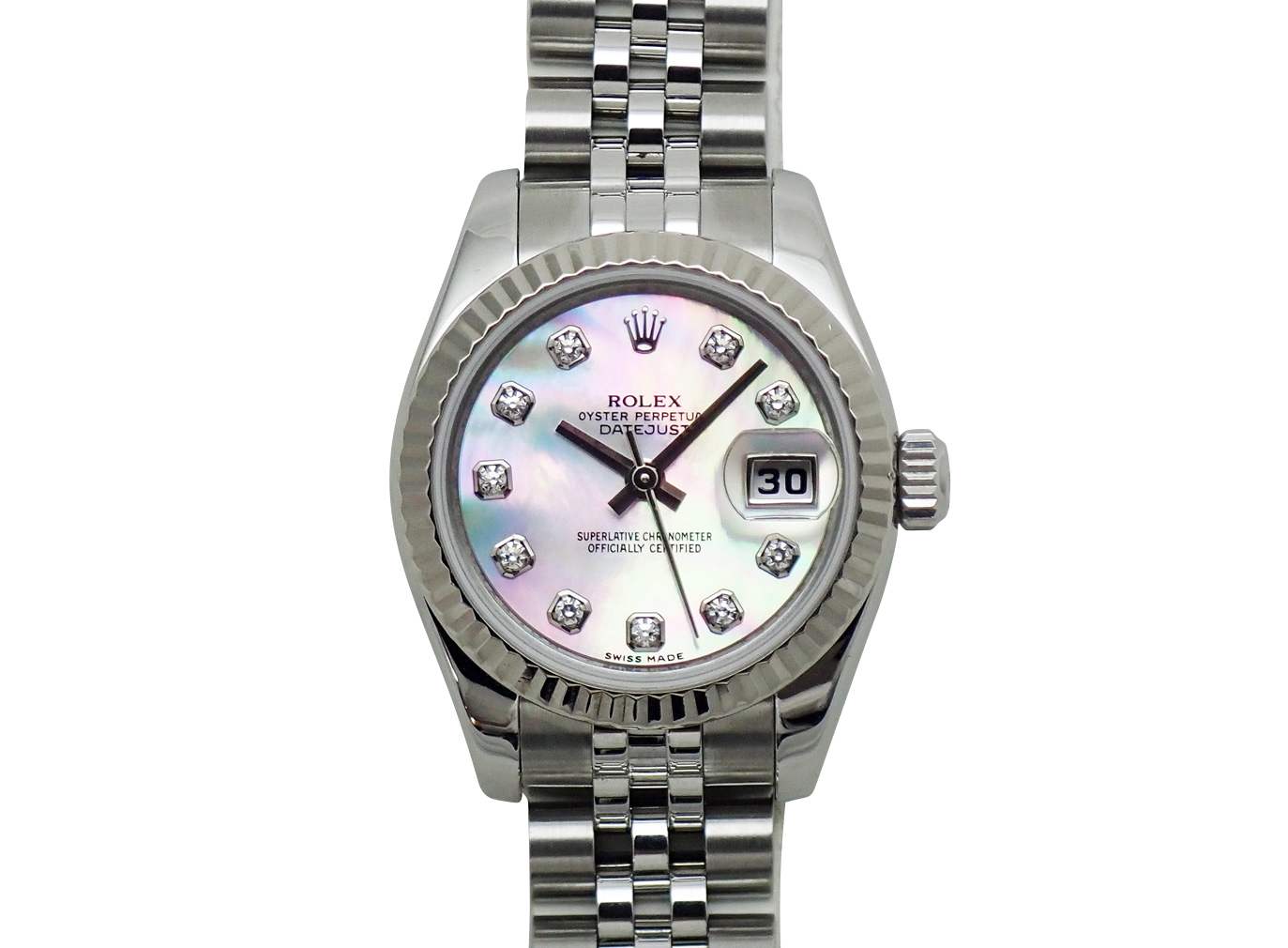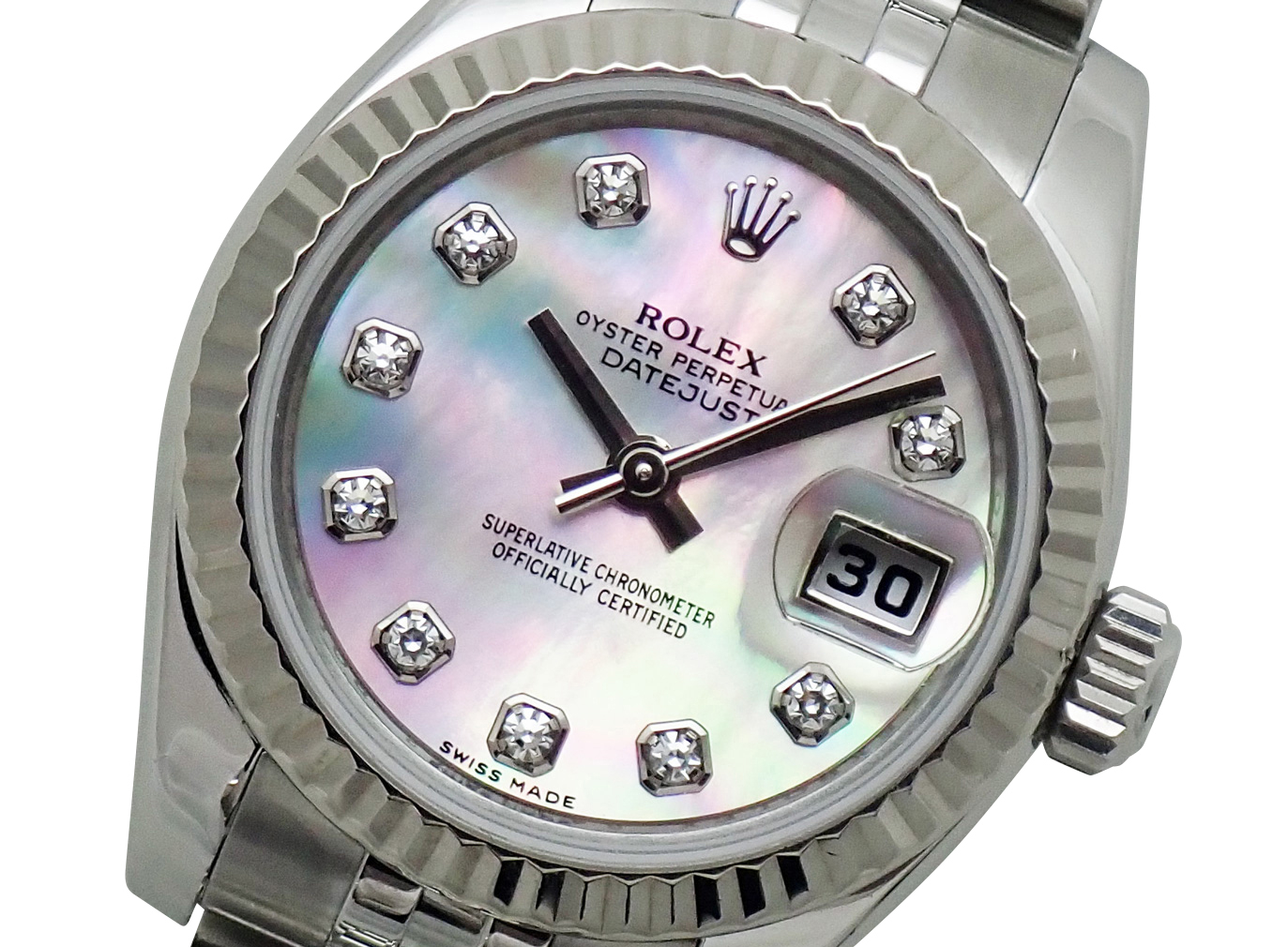 ロレックスを代表するデイトジャストは飽きのこないデザインの為、スーツ、カジュアル、シーンを問わずお使いいただける万能アイテムです。WGベゼルがラグジュアリーな演出してくれます。G番・10Pダイヤ シェル文字盤モデル。