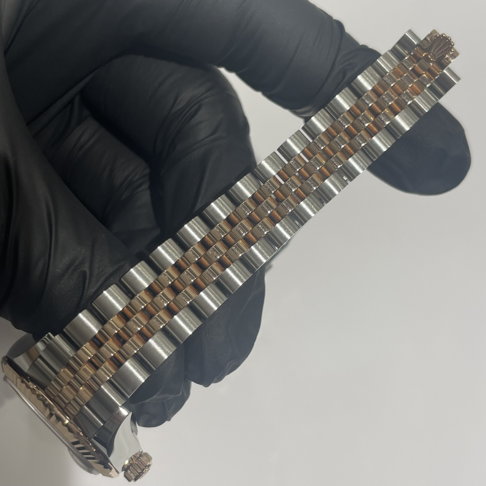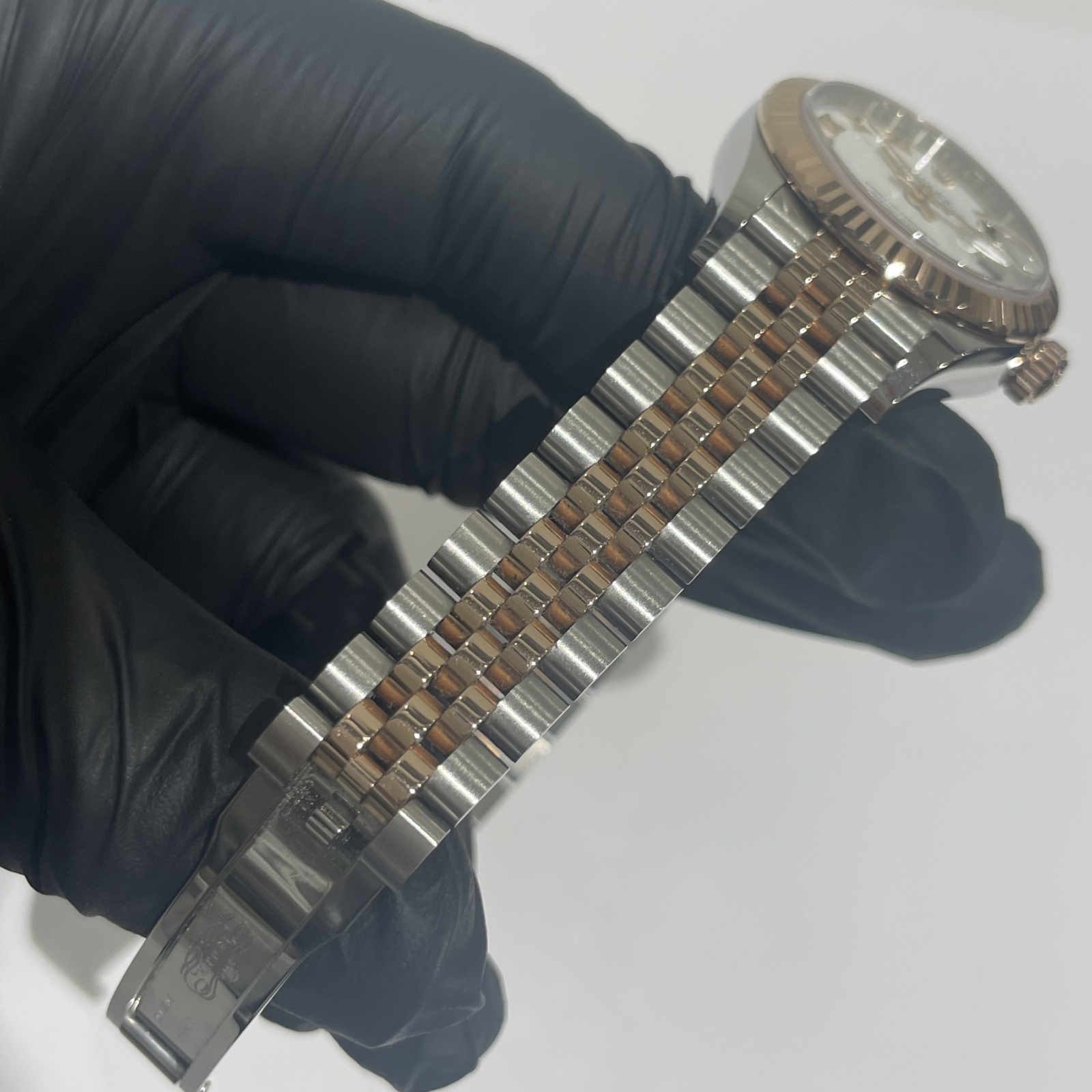 特に人気のジュビリーブレスレットが装着されたモデルで、文字盤も爽やかな白文字盤にローマインデックスが映えるお品物です。