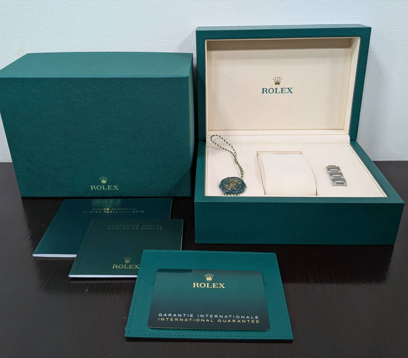 箱・保証書(2026年1月)・冊子・グリーンクロノメータータグ・コマ×3