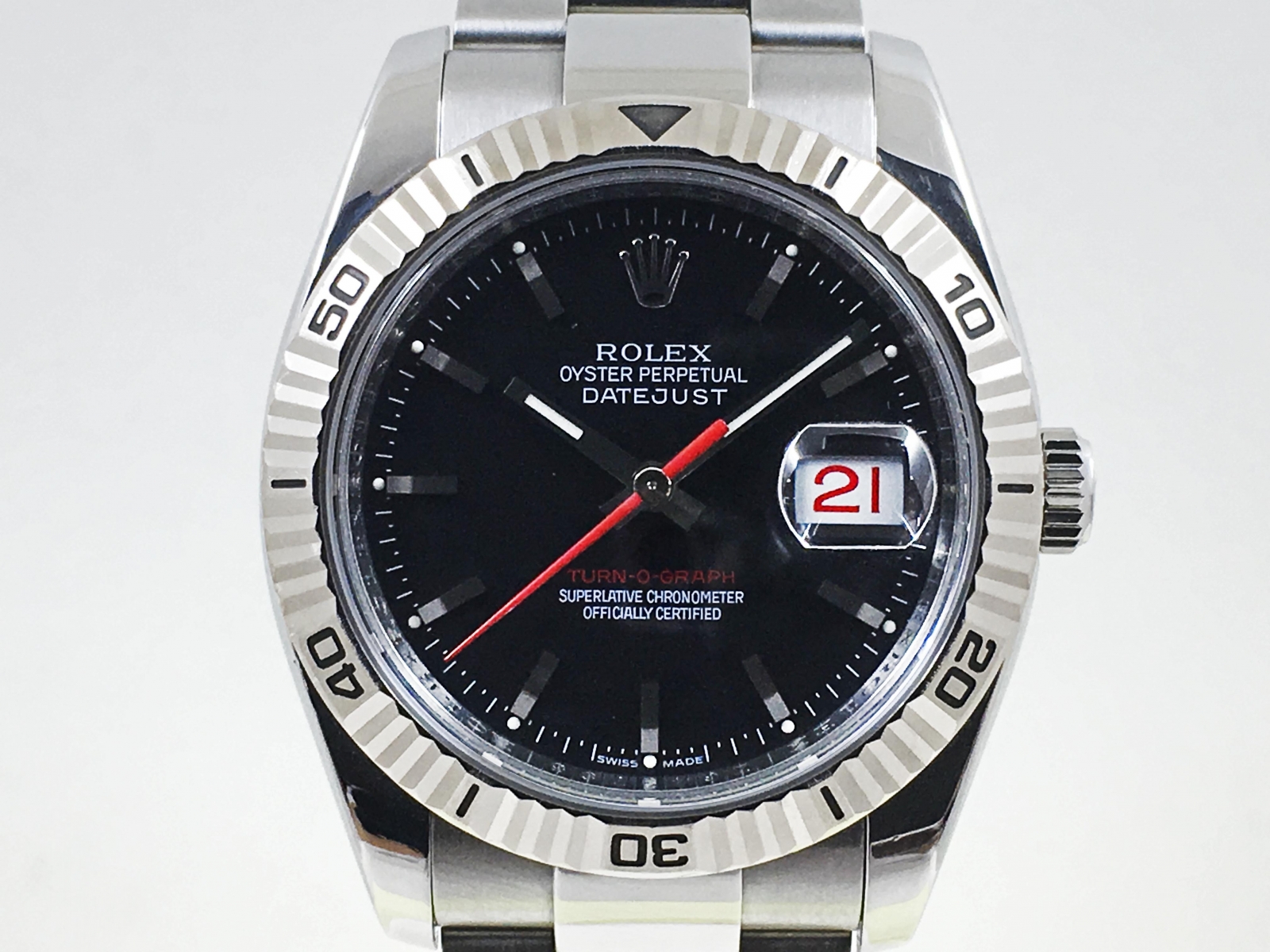 生産終了モデルRef.116264 ターノグラフの黒文字盤が入荷しました!とても格好良いですね。赤い針が効いています。ルーレット仕様の一品です、いかがでしょうか?