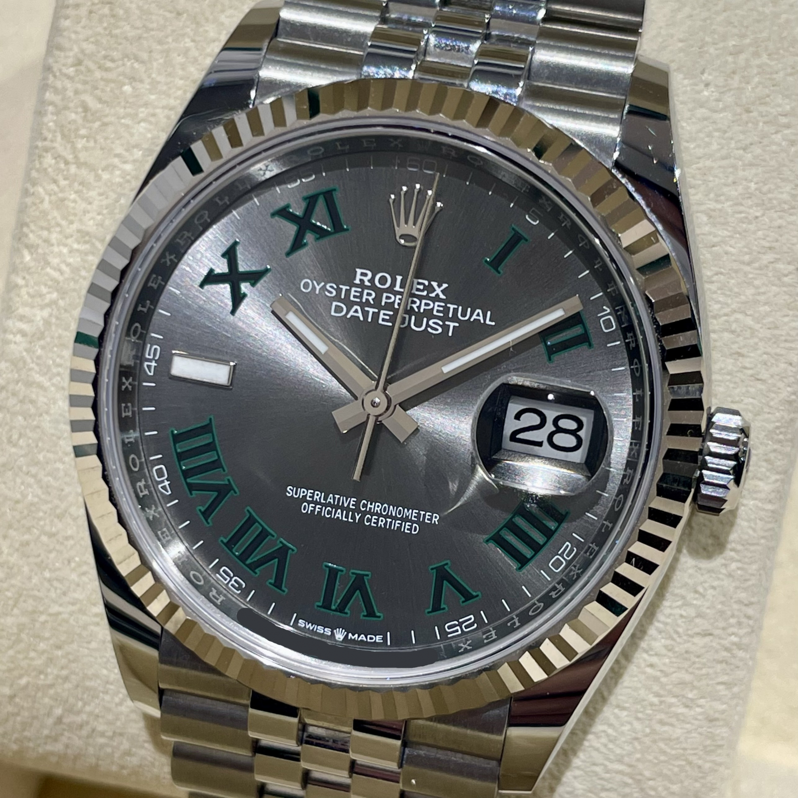 今回入荷してきたモデルは、デイトジャストの中でも人気の高いスレートローマ文字盤となっており