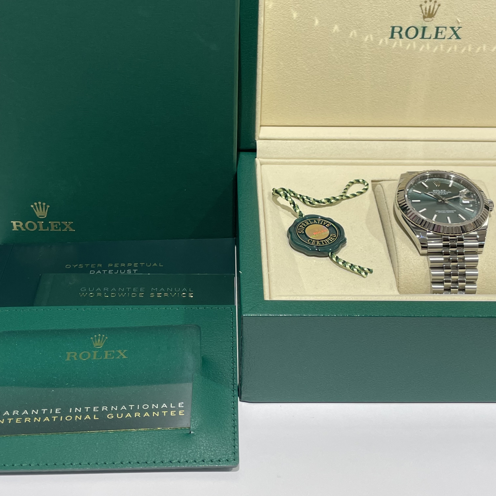 こちらは大人気のミントグリーン文字盤にジュビリーブレスレットが装着されたモデルです。