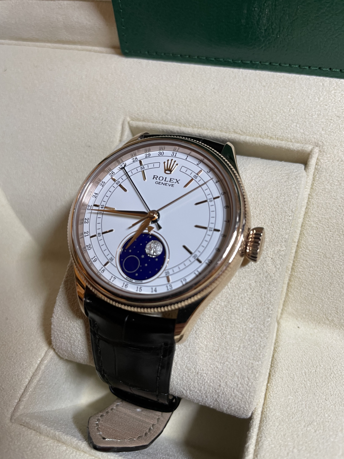 ROLEXの店頭でも見かけることが少ないチェリーニのムーンフェイズです。高級感があり、とても美しい時計です。買い替えのため手放すことにしましたが、二次市場では高騰傾向のようですので、提示価格はお買い得だと思います。