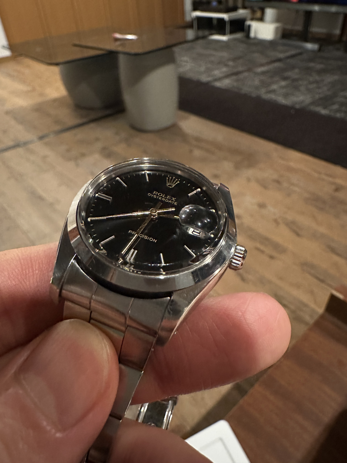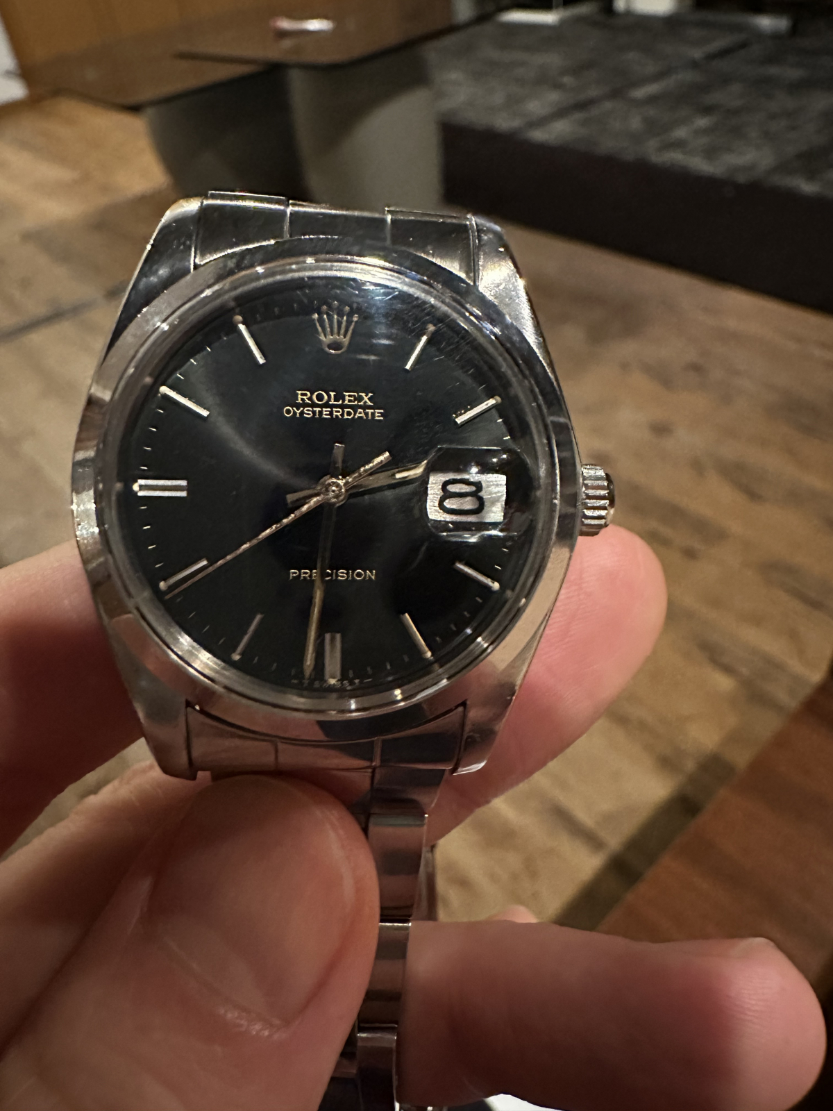 コメントありがとうございます! ご質問の文字盤についてですが、専門知識がなく「ブラックミラー」かどうかの判断は難しいところです。文字盤はブラックで、ヴィンテージのロレックス オイスターデイト Ref.6694としては比較的良好な状態だと感じております。 秒針などに多少の経年劣化は見られますが、ヴィンテージらしい風合いを残しつつ、全体的にきれいなコンディションかと思います。相場よりもお求めやすい価格で出品しておりますので、ヴィンテージ品の特性をご理解いただける方にぜひご検討いただければ幸いです。 写真で状態をご確認いただき、もし追加のご質問や気になる点がございましたら、いつでもお気軽にご連絡ください! どうぞよろしくお願いいたします。2025/09/08