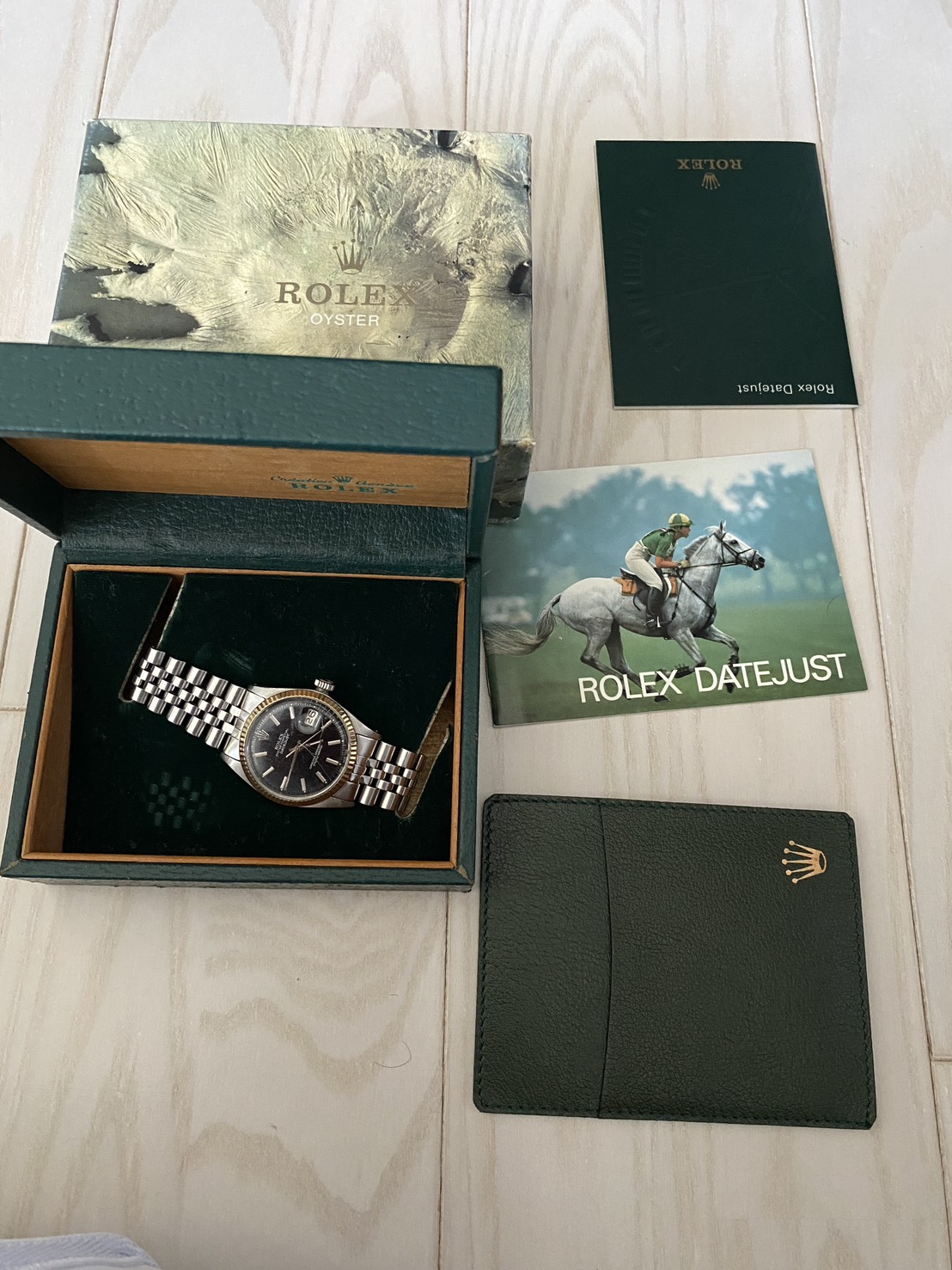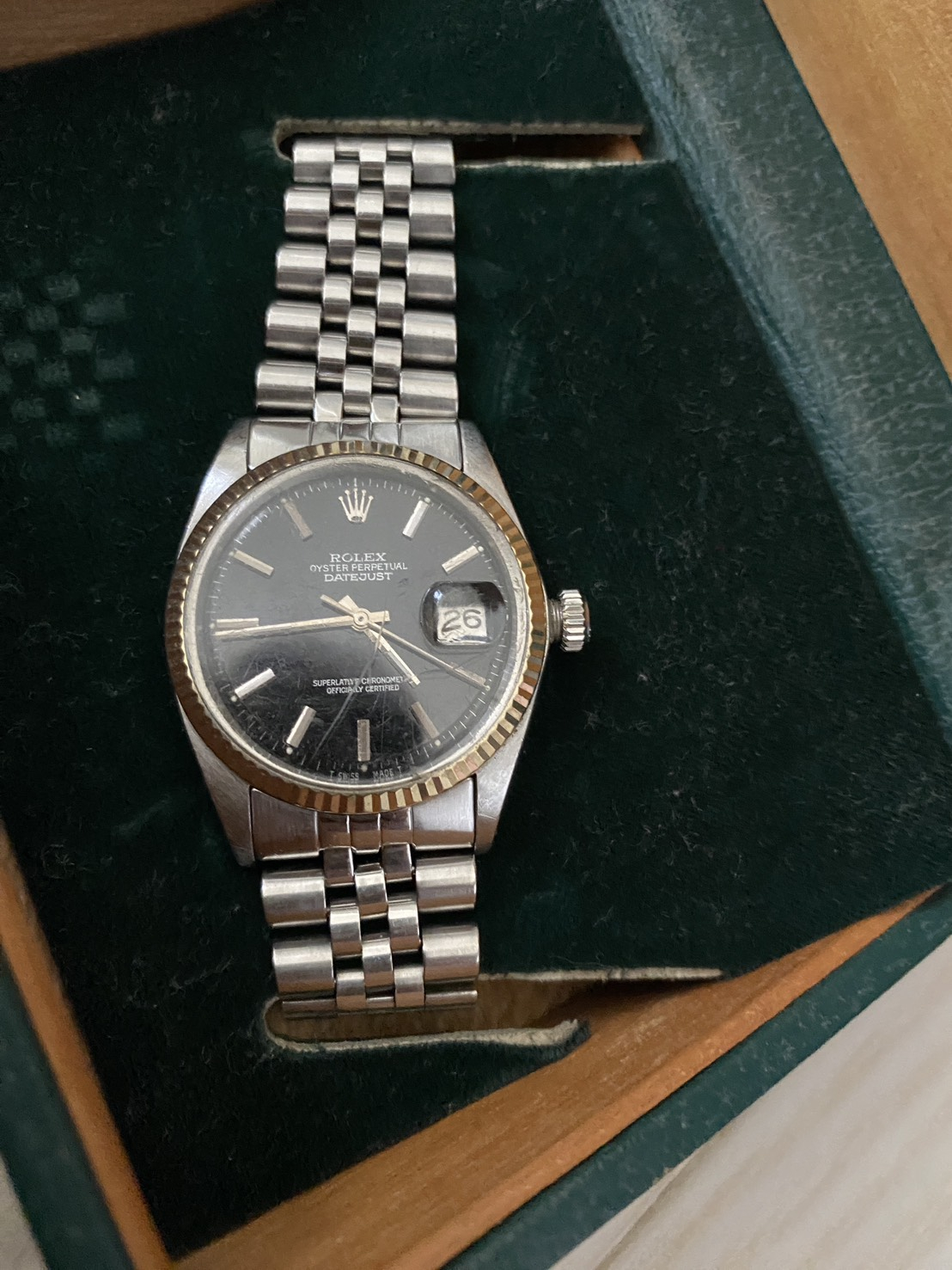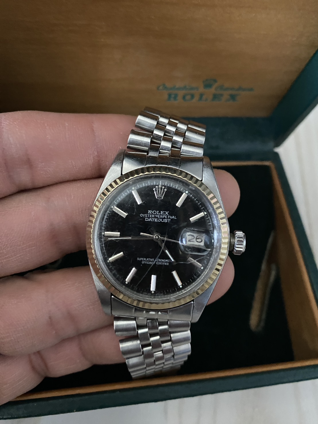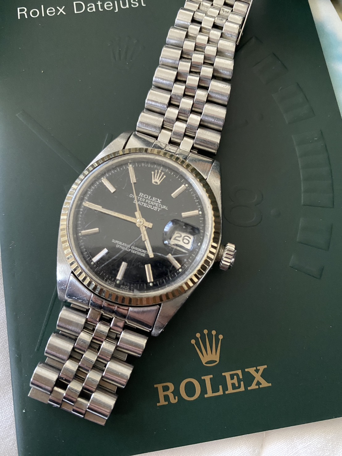 アンティークのROLEX[1971年]の自動巻きデイトジャスト、ブラックダイヤル。リューズのねじ山修理必要。時計動作正常です。