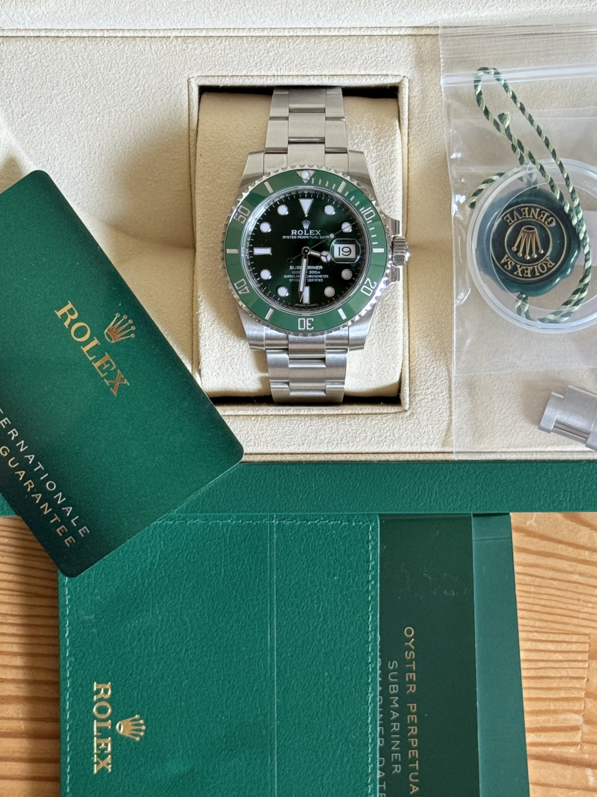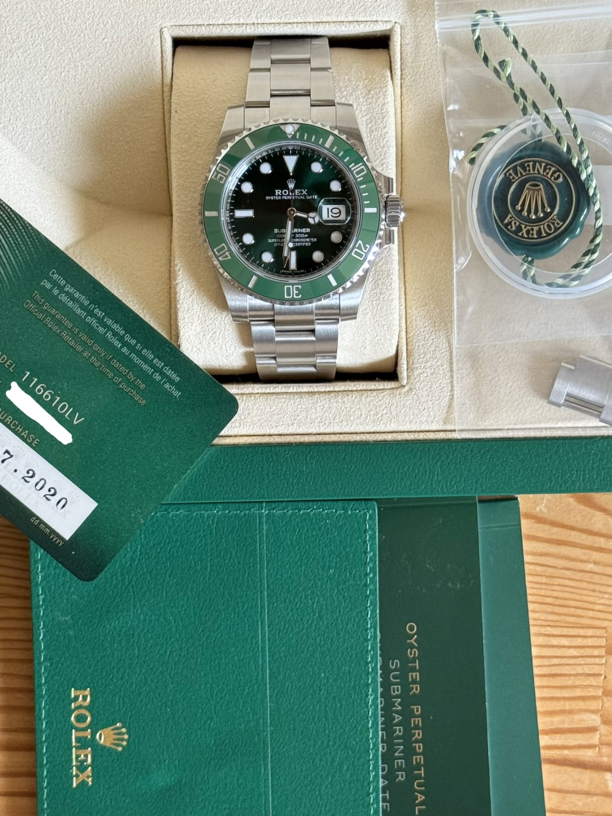 箱・保証書(最新ギャラ:2020年7月印)・冊子・グリーンクロノメータータグ・コマ×1