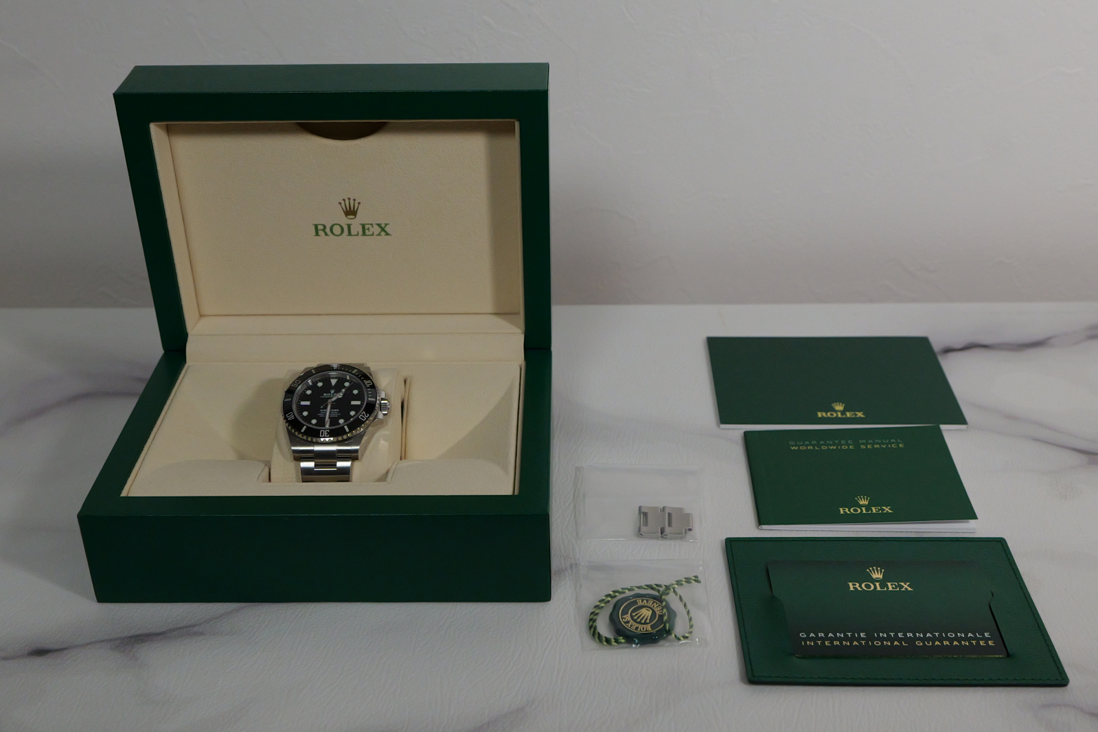 箱、国内正規店保証書(2023年7月印)、冊子、グリーンクロノメータータグ、コマ(正規店購入時に2コマ外して保管しています)