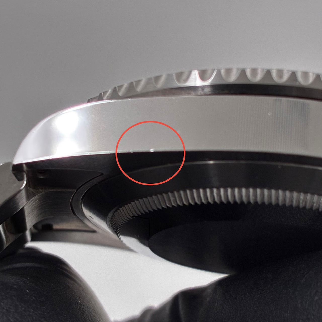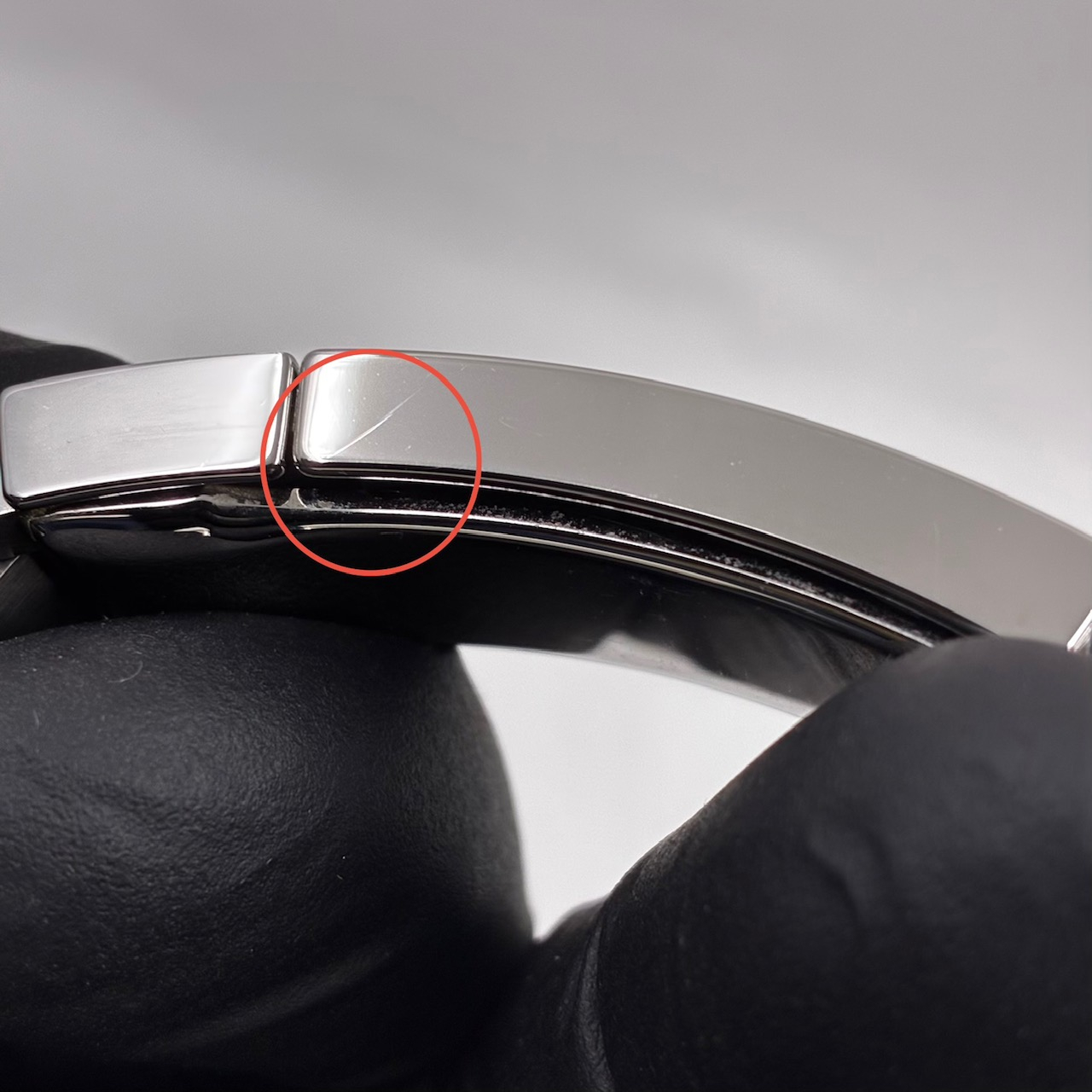 当てキズ、薄いですが長めの線キズは赤丸で囲っています。