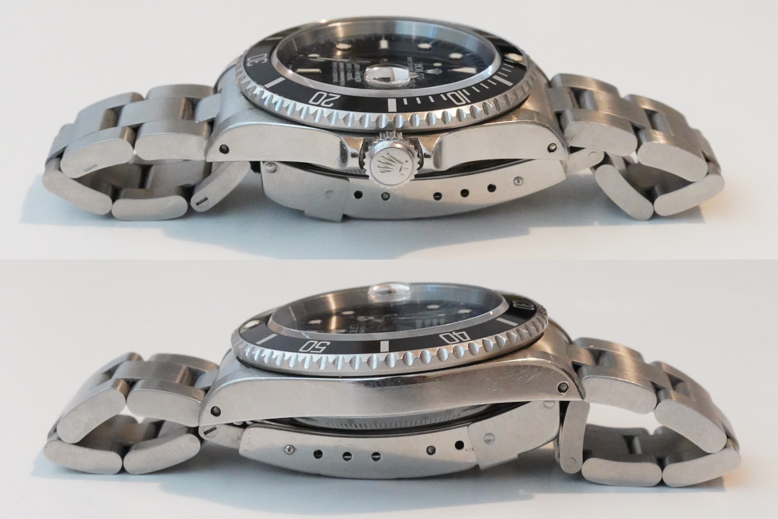 王冠のロゴはハッキリと立っています。(当方未研磨の別のロレックスも所持しているため、そちらと比較してもロゴのハッキリとした立ち具合が同じです)