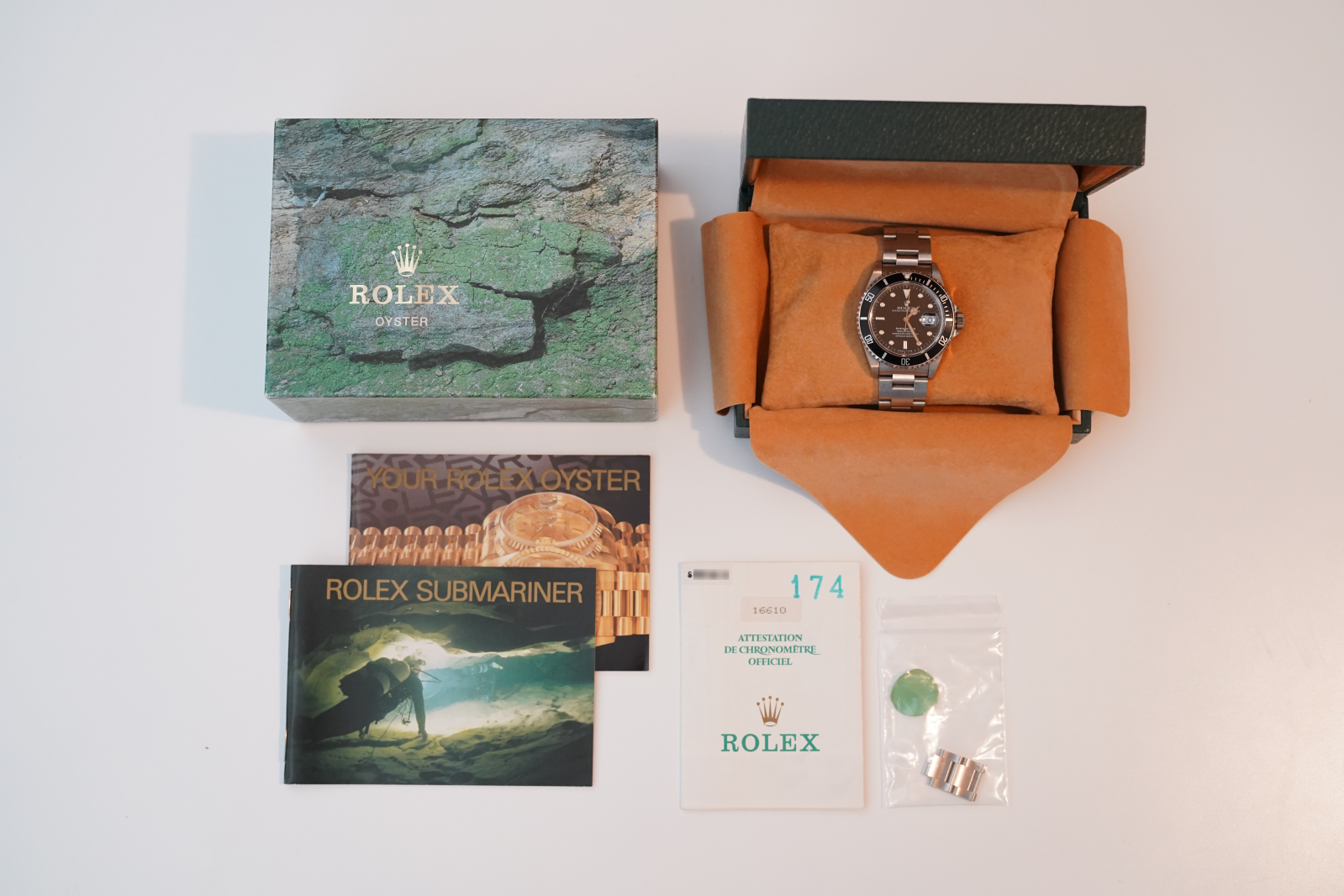 付属品は、ロレックス内外箱・ ギャランティ・余りコマ2・冊子2冊・剥がれた裏蓋のシール(ロレックスのロゴはスレて消えています)です。
