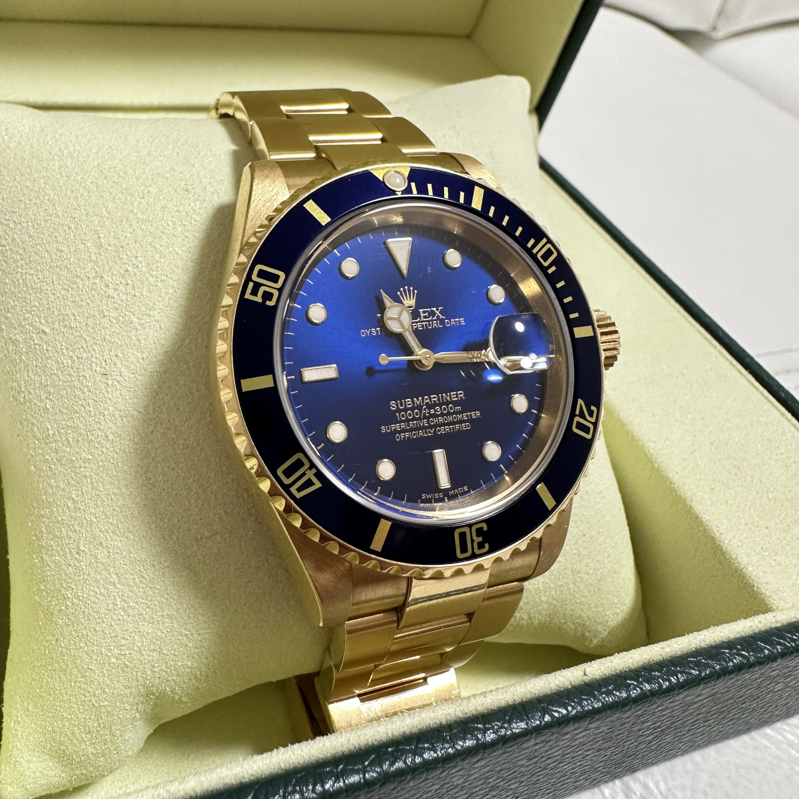 ロレックス サブマリーナ 青サブ 16618 です。1953年の発売以来、不動の人気を誇る大人気ダイバーズウォッチ「サブマリーナ」です。こちらは1989年〜約20年も生産されたロングセラー世代 Ref.16618 で華やかなイエローゴールド無垢にブルーの文字盤とベゼルが映えます。本品はルーペで拡大して確認すると、使用による細かなスレや傷はありますが肉眼ではほとんど見えない程度で敢えてポリッシュせずに出品しています。ギャランティに2004年10月に国内正規販売店で購入した記載がございます。