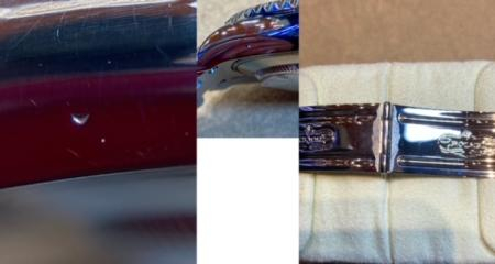 画像の赤丸部に磨きで残った小さな打痕があります。また、クラスプ内に表面上ではありますが、比較的大きな瑕疵もございますので画像でご確認下さい。