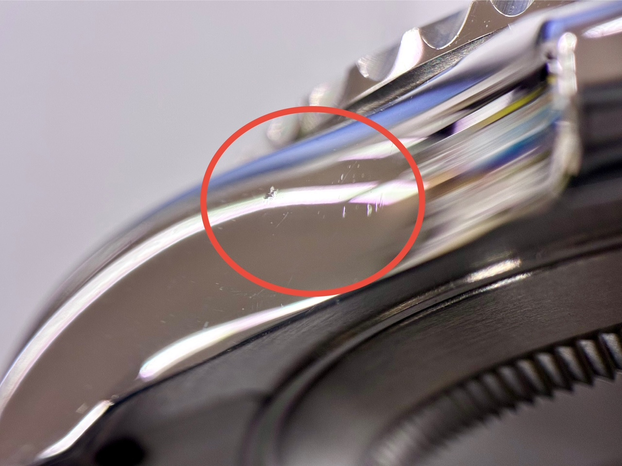 バックルの鏡面部分に小キズ、リューズ下側に細かな当てキズがあります(画像参照)。