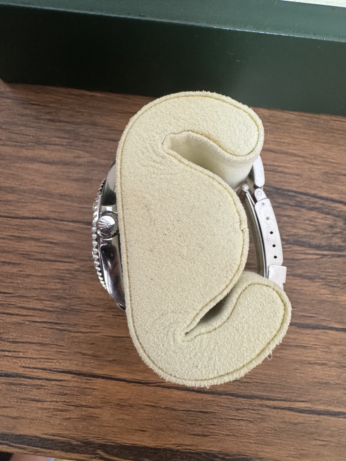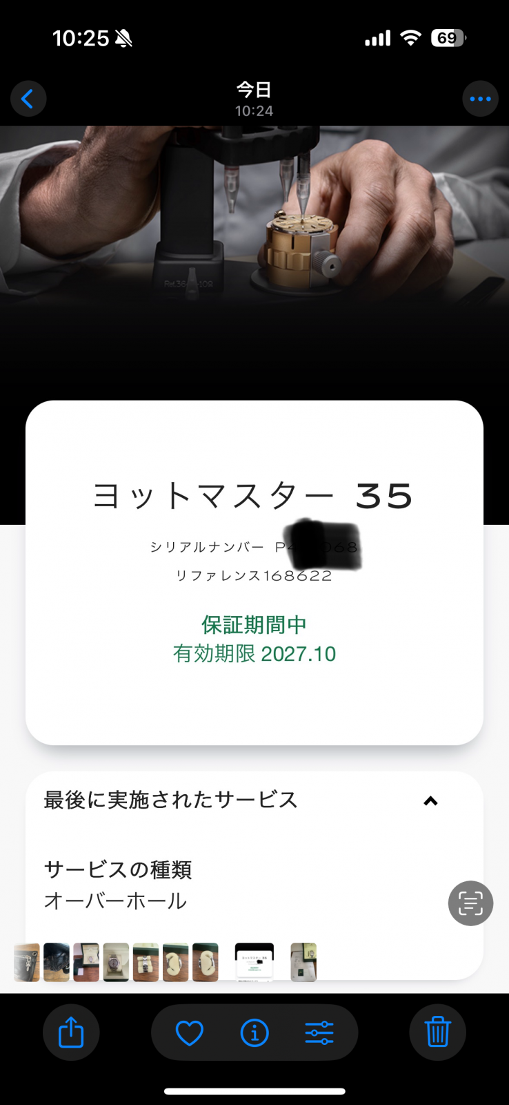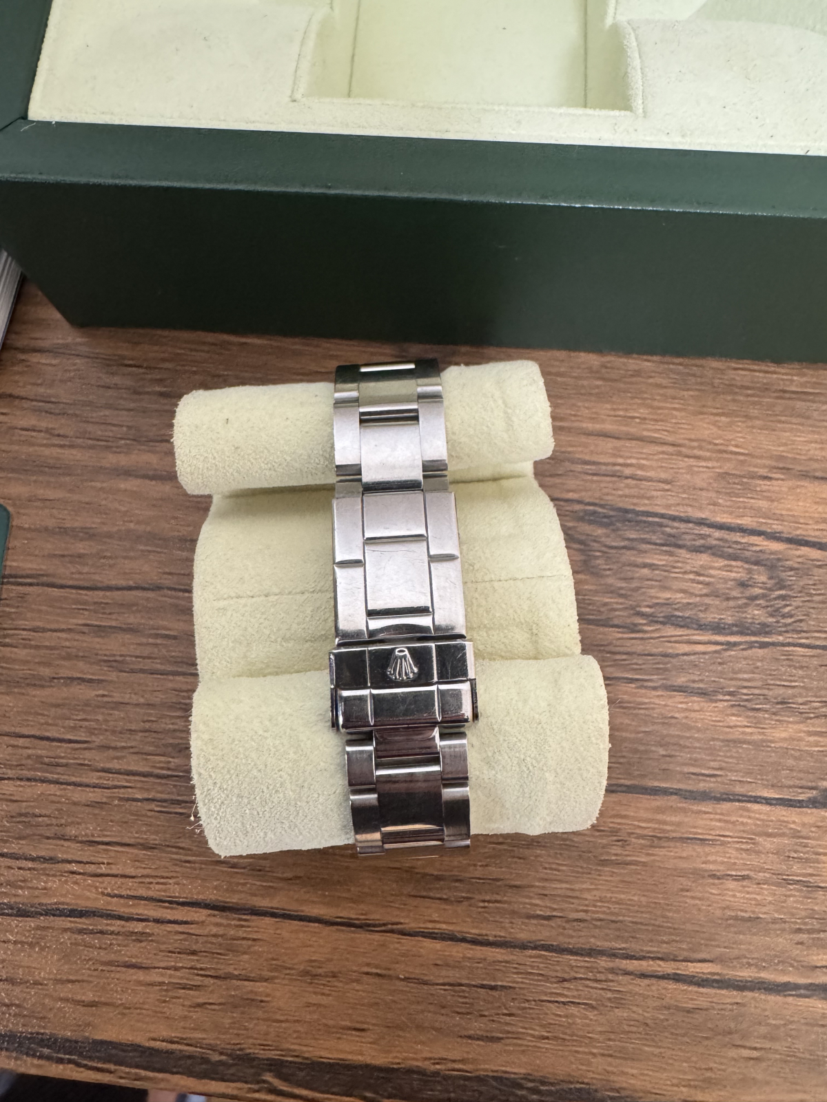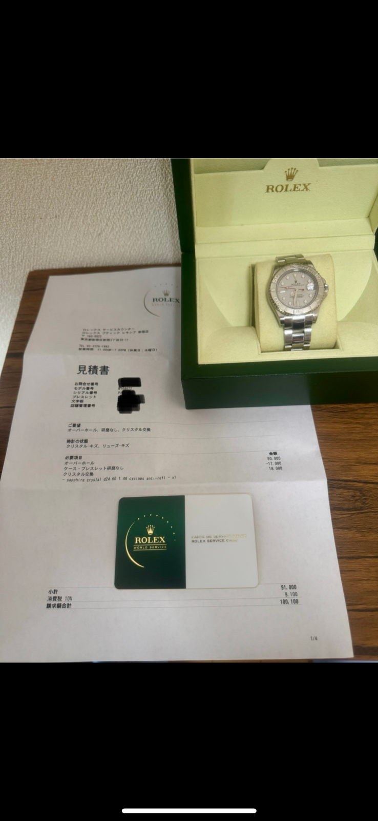 ヤフオクで中古で購入、レキシア新宿にオーバーホールとガラス交換を依頼して25年10月に返却されたものです。メーカー保証期間は27年10月迄となります。腕周りは約16.5cm程となります。
