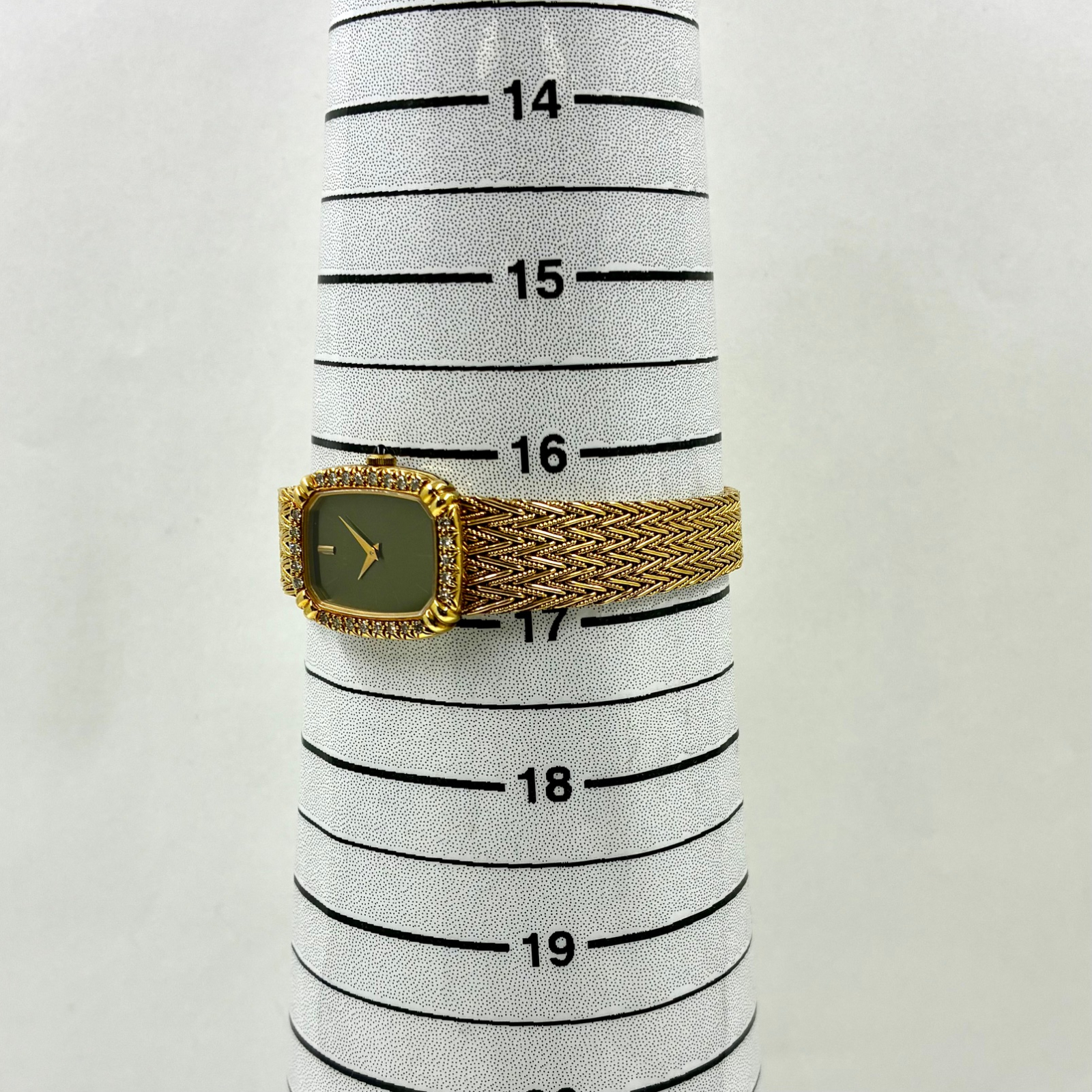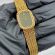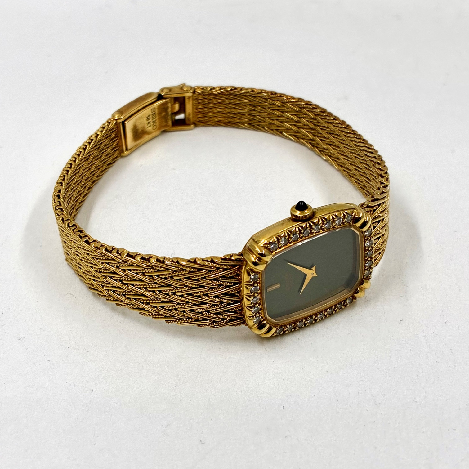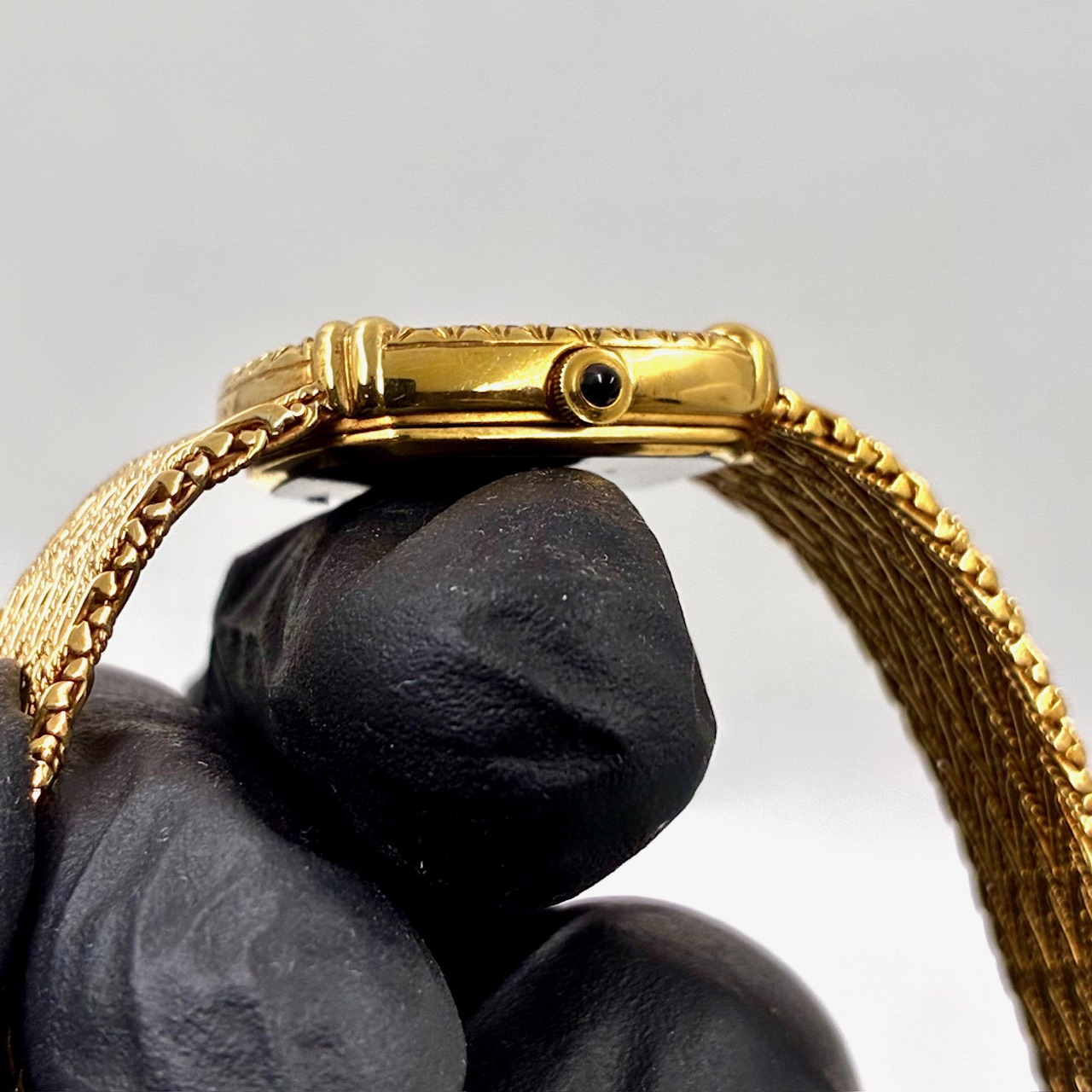 26石ものダイヤモンドがベゼルにセッティングされたエレガントなドレスウォッチ クォーツ式 (電池式)イエローゴールド(18金)の2針モデルです。ブレスレットはケースと一体型です。長さも比較的ありブレスレットもしなやかです。