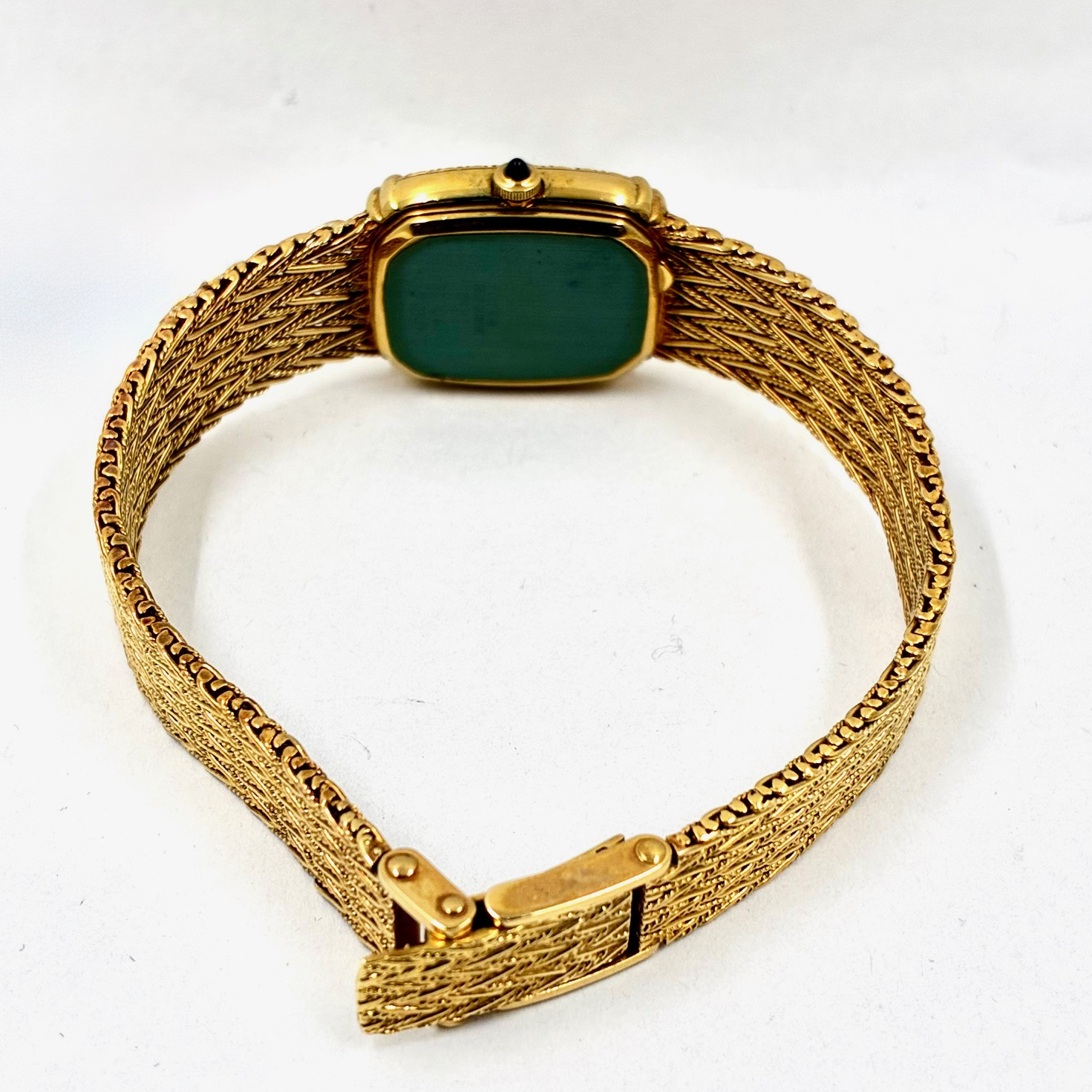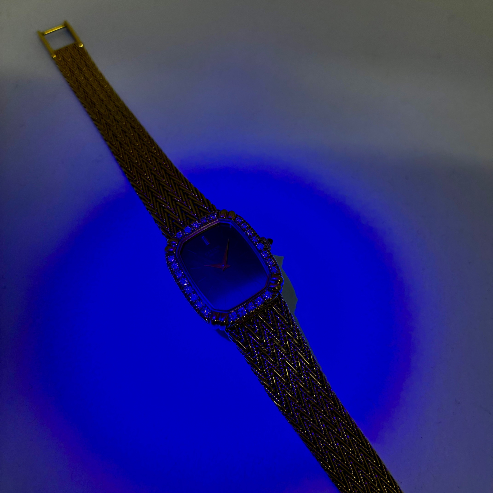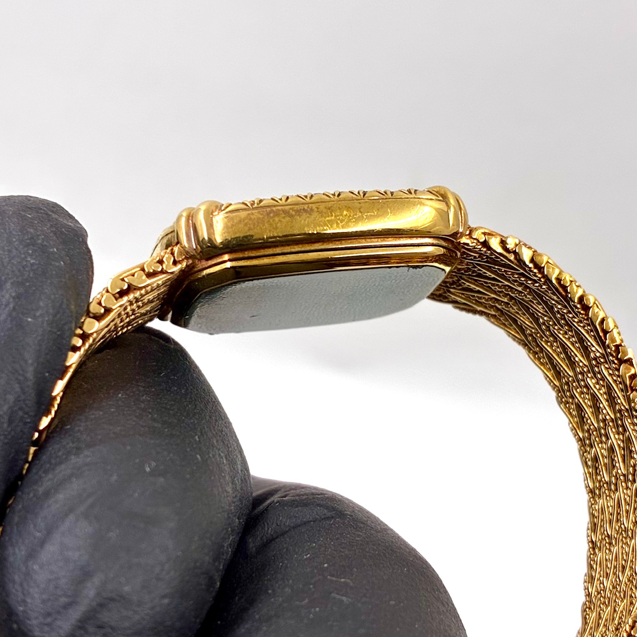 26石ものダイヤモンドがベゼルにセッティングされたエレガントなドレスウォッチ クォーツ式 (電池式)イエローゴールド(18金)の2針モデルです。ブレスレットはケースと一体型です。長さも比較的ありブレスレットもしなやかです。
