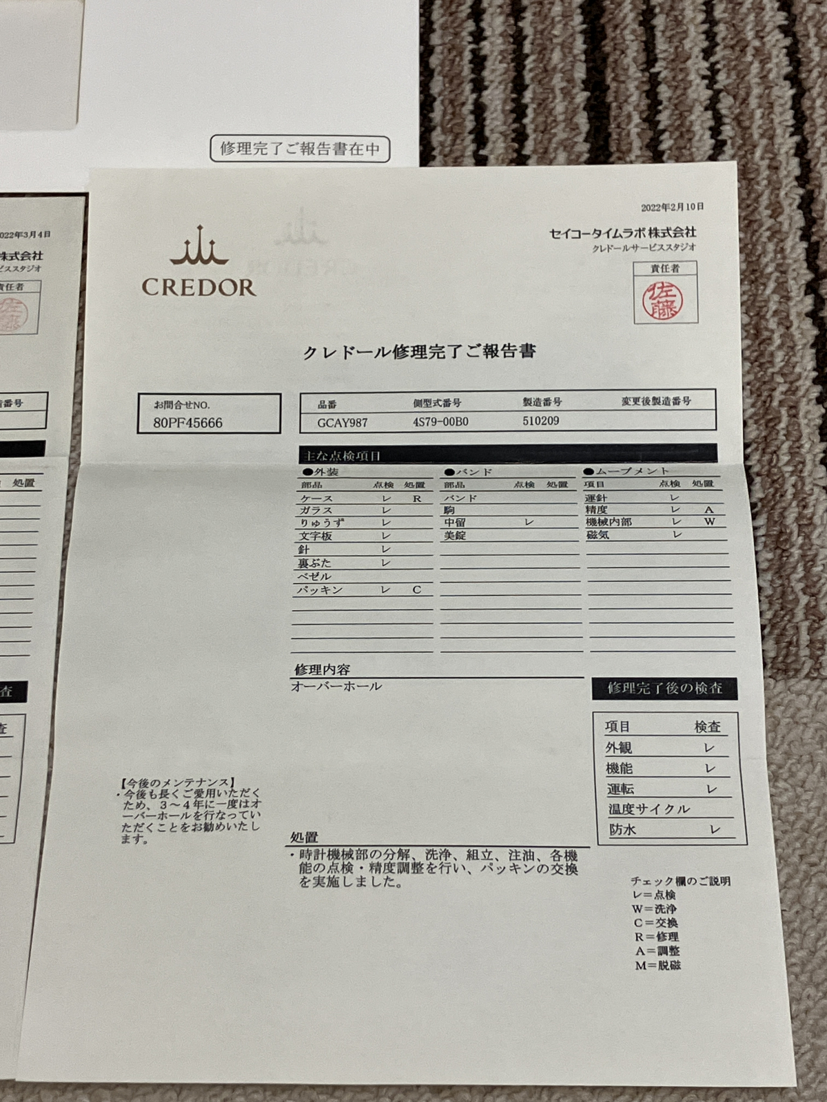 OH後は、月1回程度は巻き上げを行い、室内装着等で状態を維持していました。