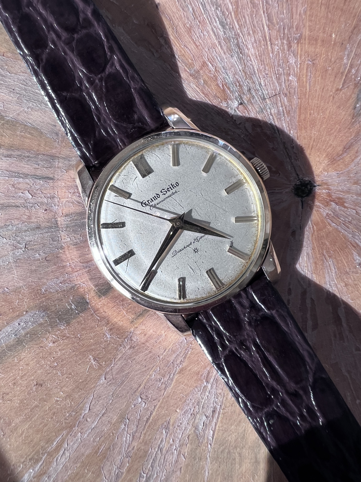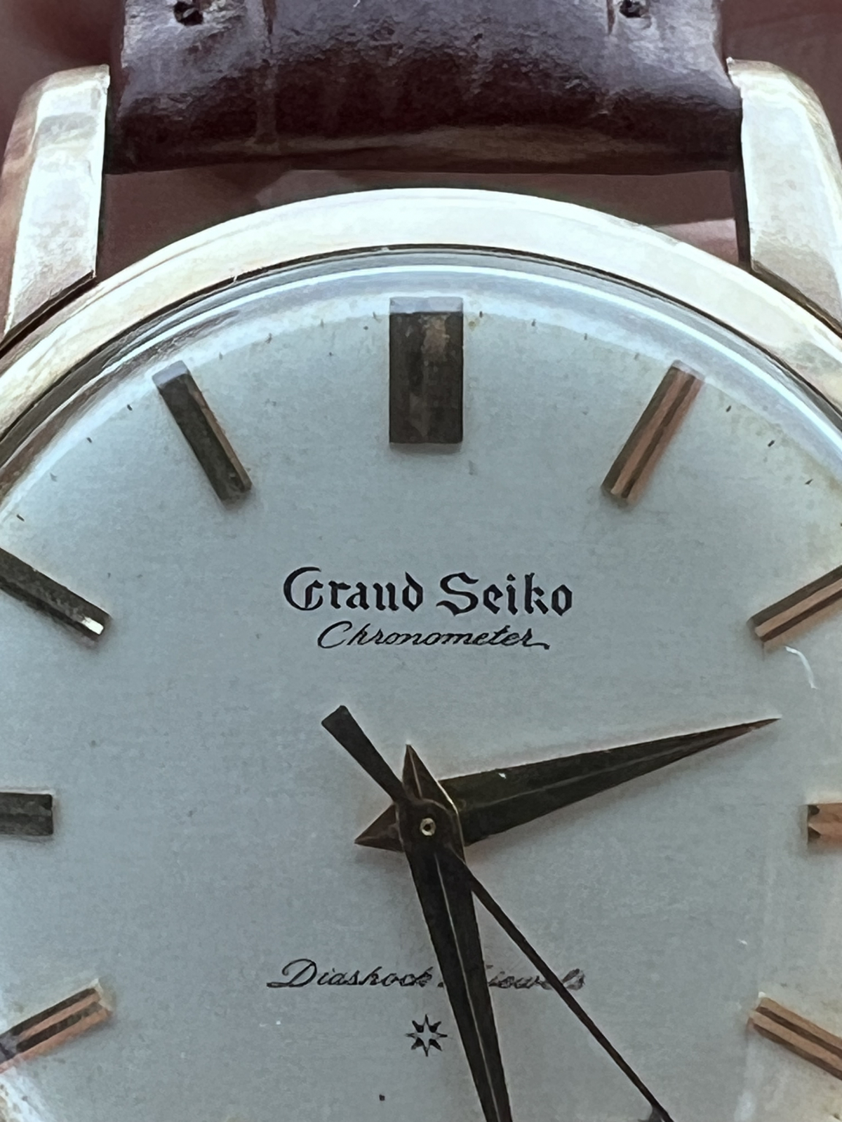 初代グランドセイコーには、プリント・ロゴ文字盤(最初期型)、彫りロゴ文字盤(中期型)、アプライド・ロゴ文字盤(後期型)の3種類の文字盤が大まかにはあります。