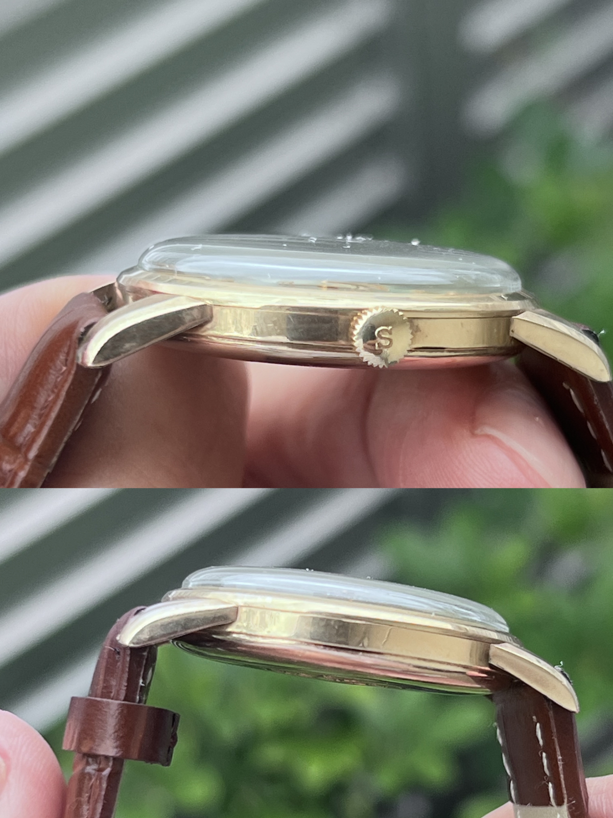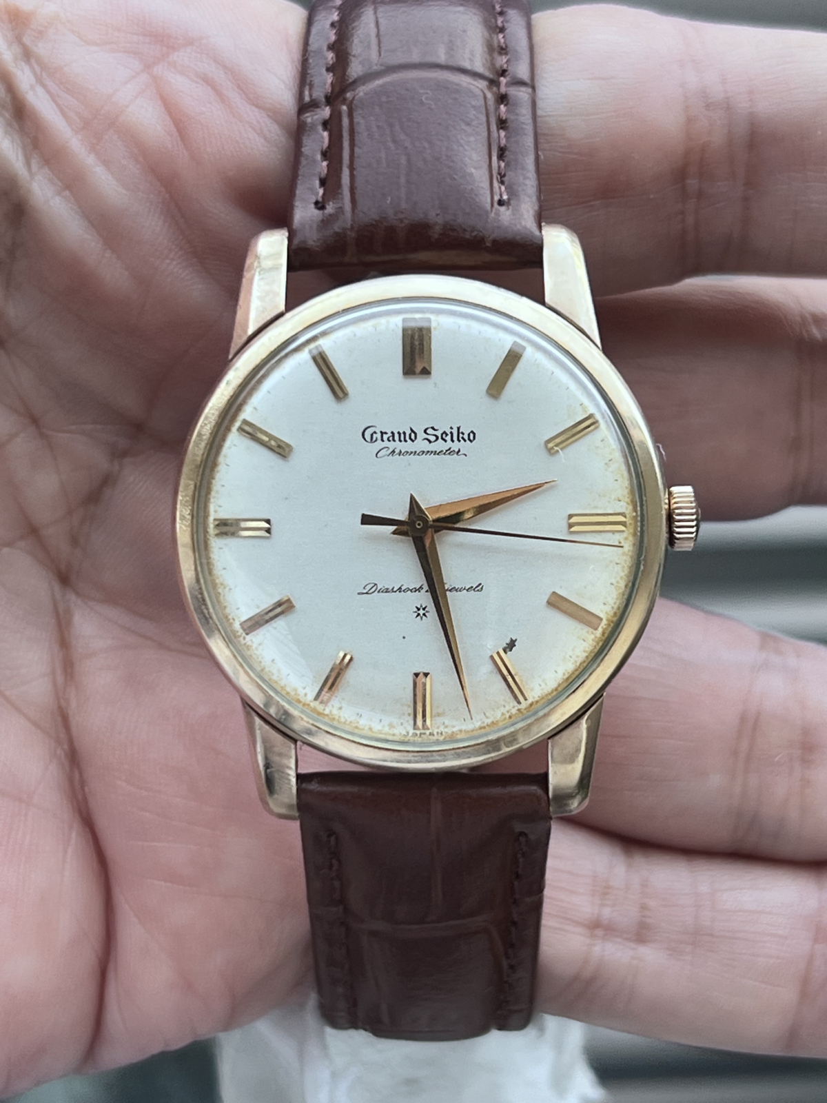プリント・ロゴ文字盤のGS1stは、アンティーク時計店では200万円を超えた金額で取引されていますが、本品は、文字盤にある程度の経年劣化(5時付近の傷と周囲の汚れ)があり、完璧な状態ではないため、かなり抑えた値付けになっています。