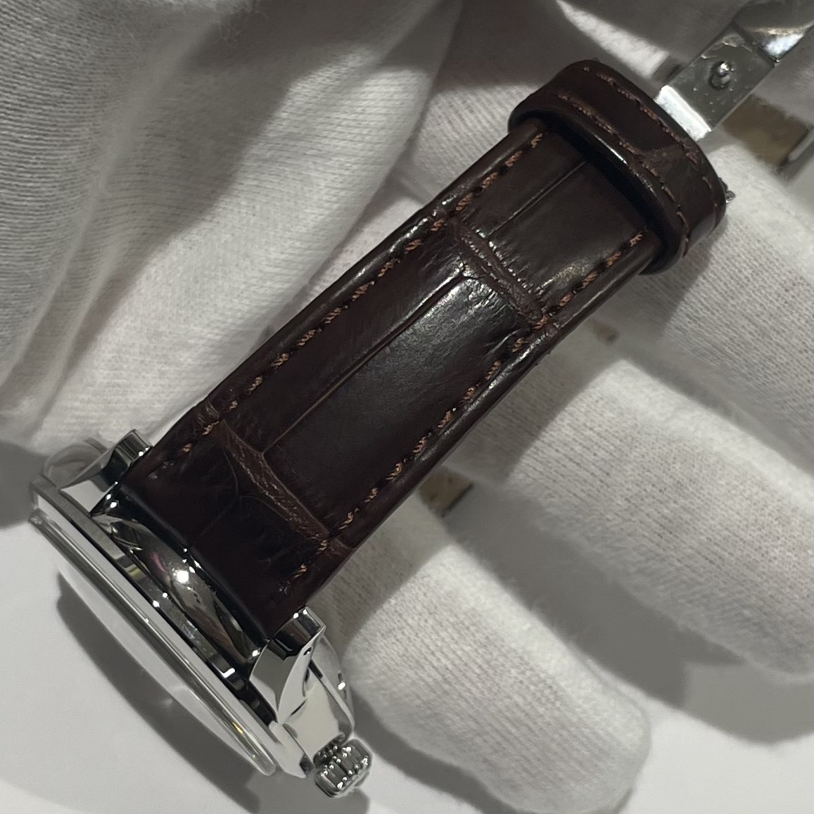 使いやすいアイボリーの文字盤と、ブラウンの革ベルトの相性が抜群な一本でございます。