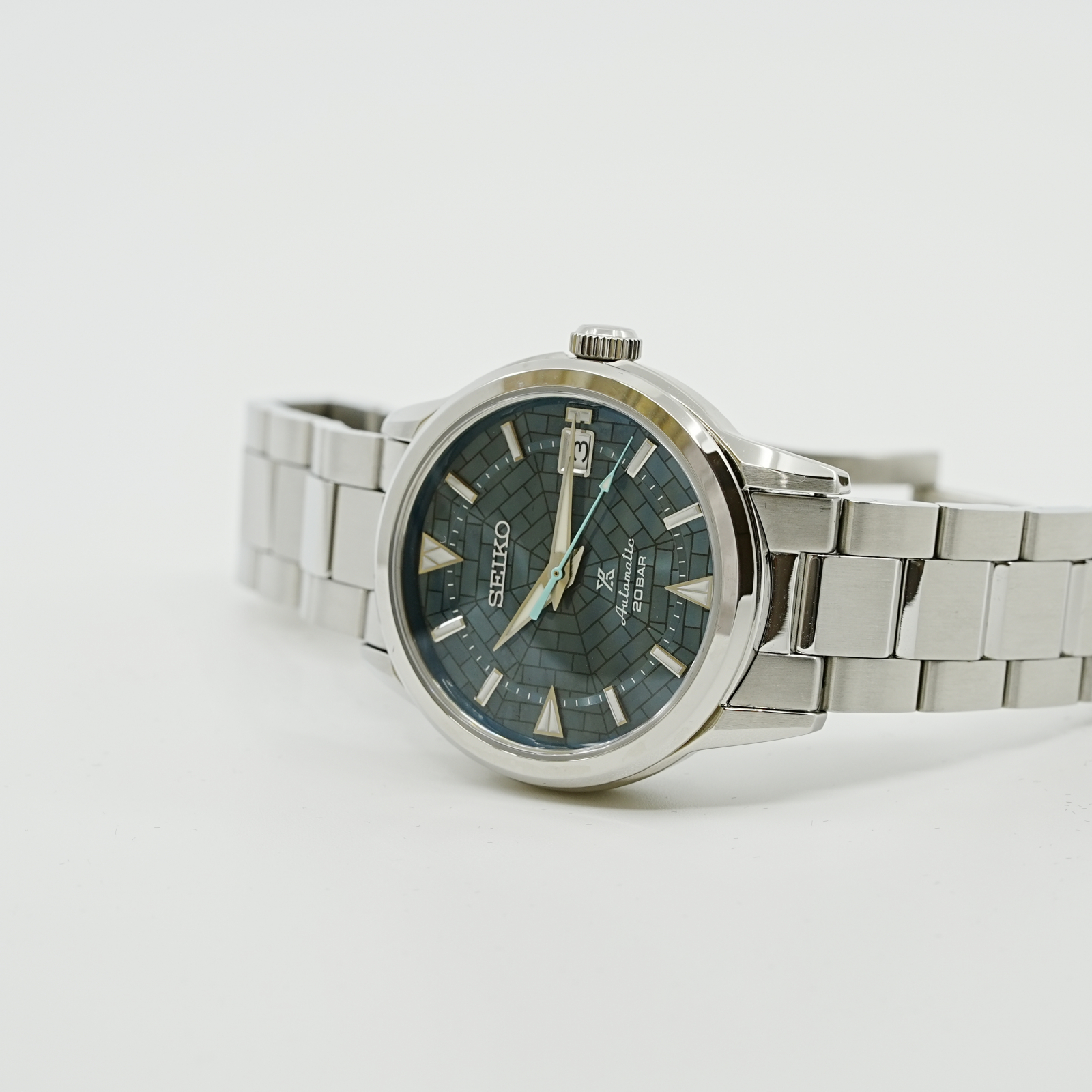 本作は、1959年に発売された「セイコー アルピニスト」をベースに、現代的なデザインに再構築し、装着性に優れた38mmサイズに仕上げたモデルです。ダイヤルに表現された銀座通りの石畳は、放射状に艶が変化し、金春色の秒針がアクセントを添えています。最大約70時間の駆動を可能にしたメカニカルムーブメントを搭載し、週末に着用せずとも、翌月曜日にそのまま使用可能な実用性を備えています。