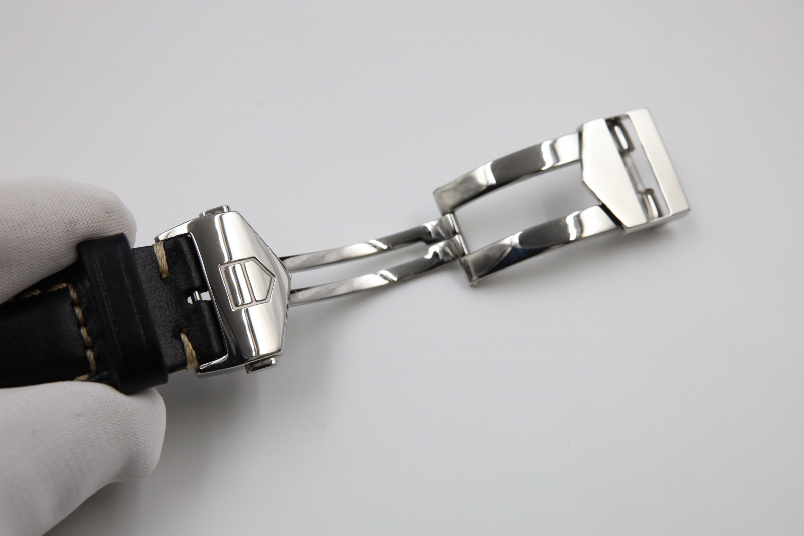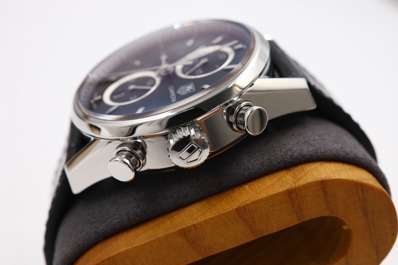 大人気のタグホイヤーカレラクロノグラフです。中古で20万円前後で購入できるクロノグラフとしては段違いの仕上げと質感の高さを誇ります。ドレスよりのスポーツクロノグラフですが、防水100メートルなのもポイントです。
