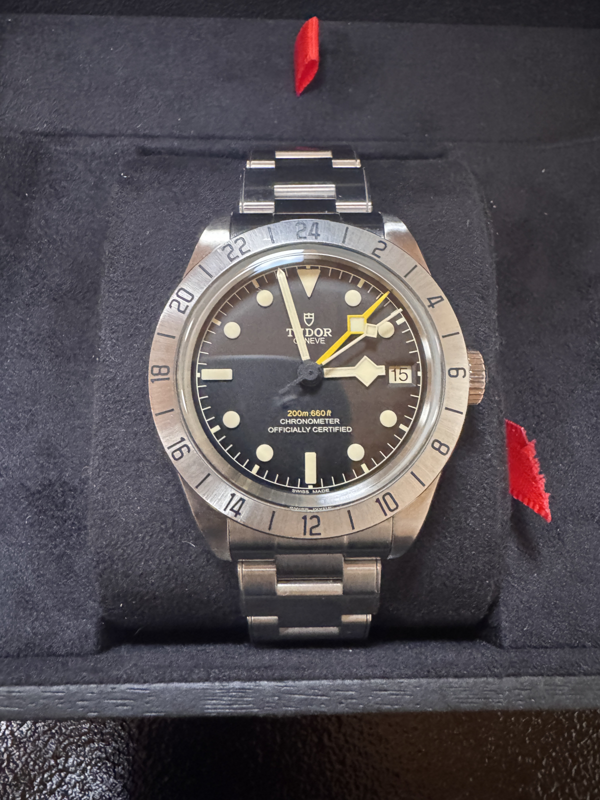 ブロンズ製のブレスに注目です!写真では赤みが強い印象ですが、実際に見てみるとどうなのでしょう。個人的に茶色や赤ベゼルが好みなのでブロンズとの相性が最高✨