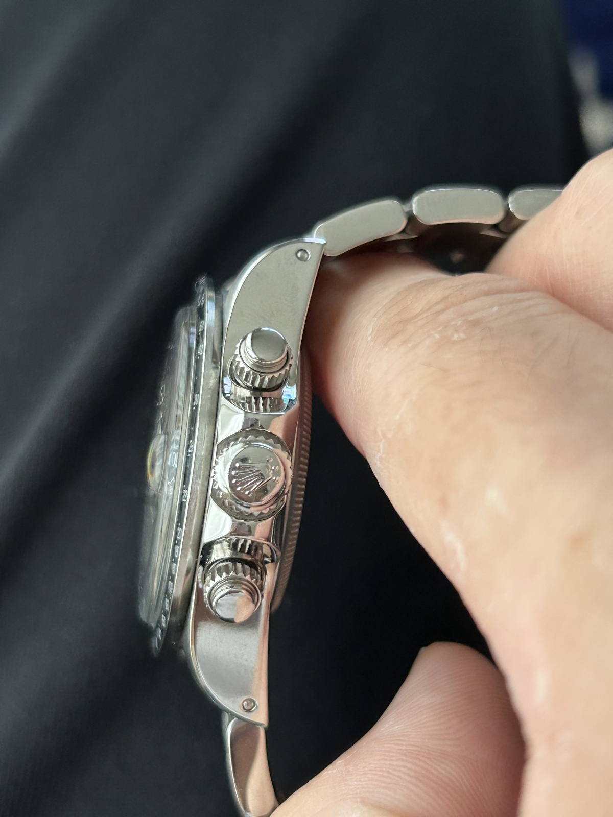 • コメントありがとうございます。拡大するとベゼルに爪に引っかかるキズ、クラックらしきものがご指摘の部分と90、170あたりに確認できます。リューズ側写真はご確認ください。よろしくお願いします。