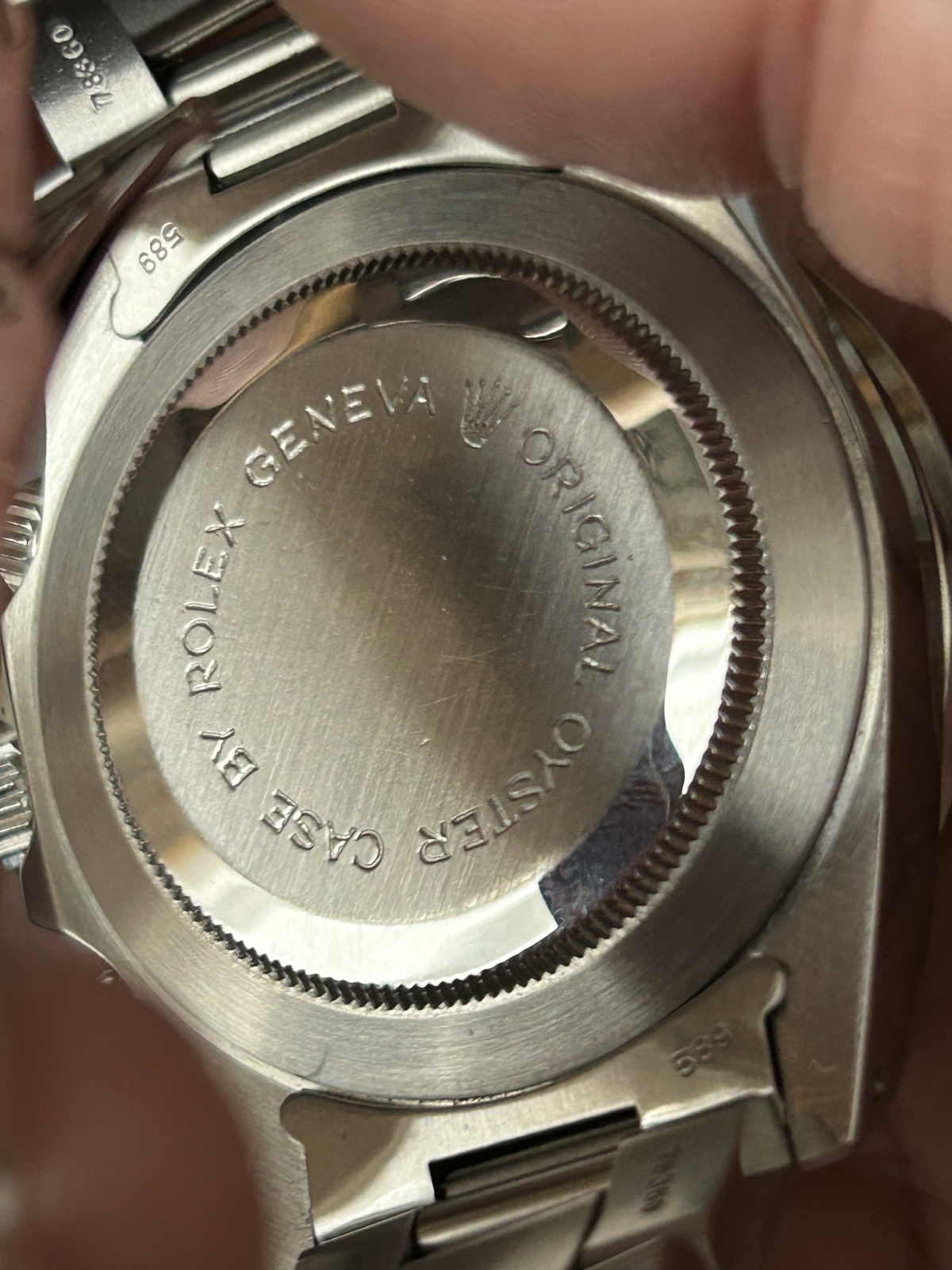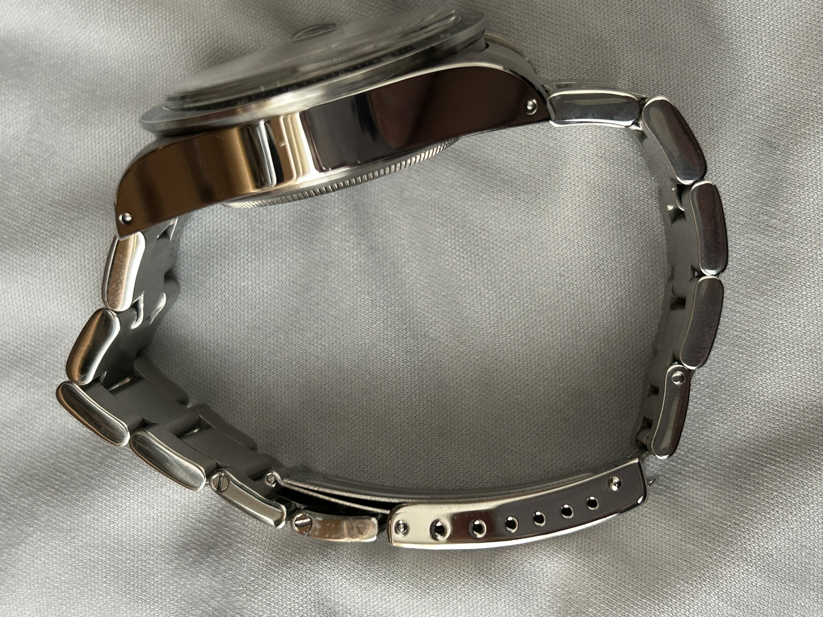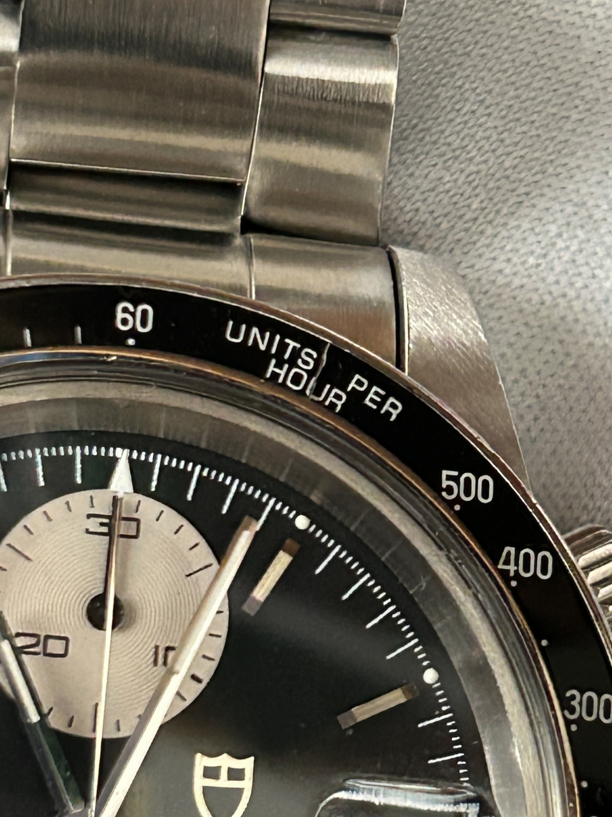 拡大するとベゼルに爪に引っかかるキズ、クラックらしきものが数箇所ございますが目立つものではありません。ケースはしっかりした印象です。ブレスは綺麗ですが年式相応といったところ、付属品は社外ケースとなります。