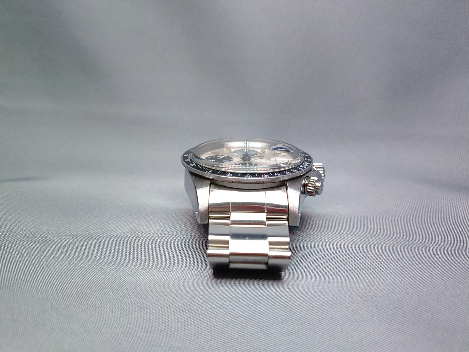 時計本体、ブレス共に仕上げ済のため若干のうすい擦れがある程度で目立つようなキズはありませんが、ステンレス製アウターベゼルの12時側エッジに当てキズがみうけられますが、プラスチックタキベゼルは目立たない薄いスレ程度の使用感です。ダイヤルですがすれ傷なく夜光落ちも無く良好な状態で綺麗です。