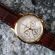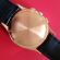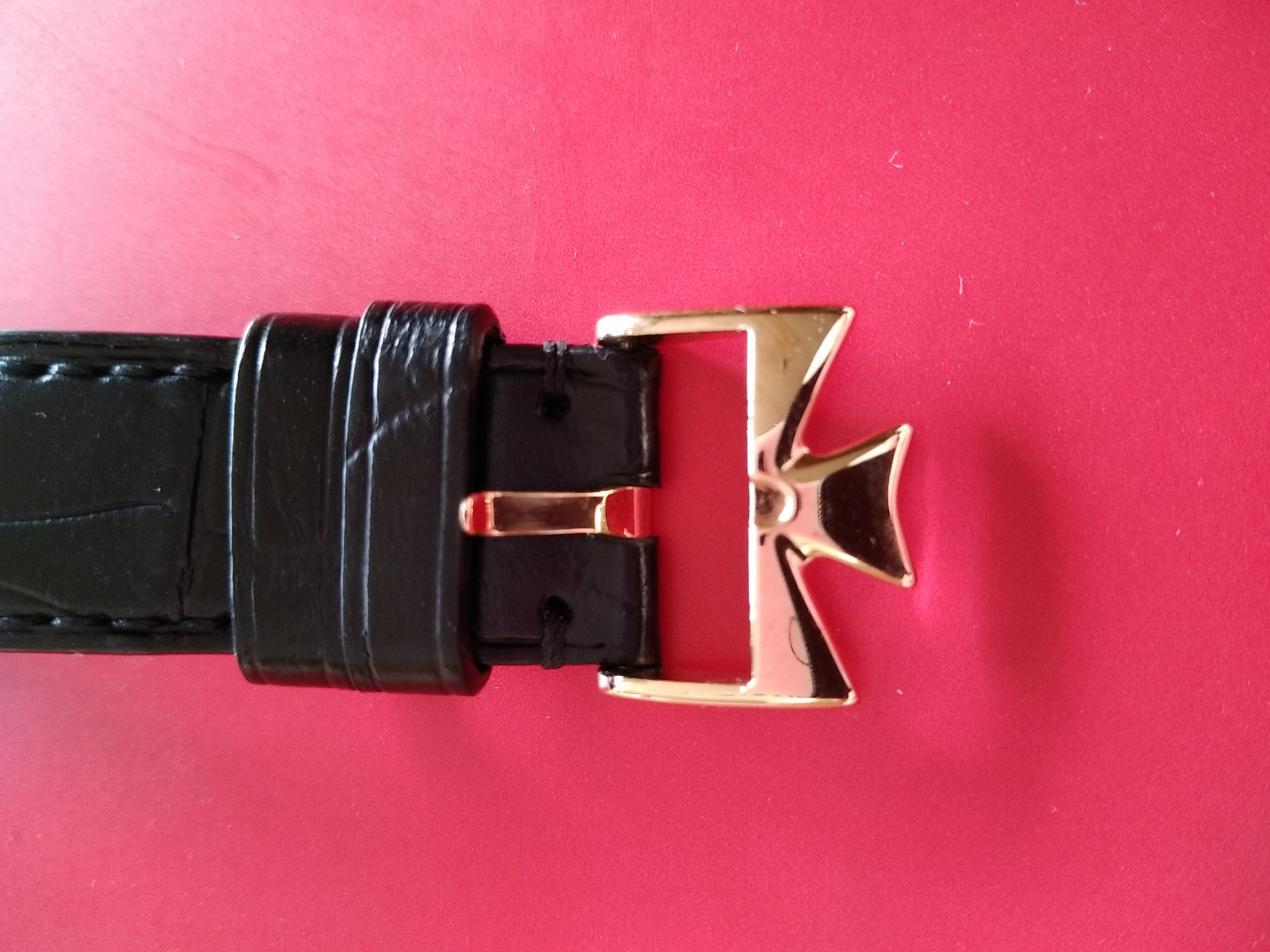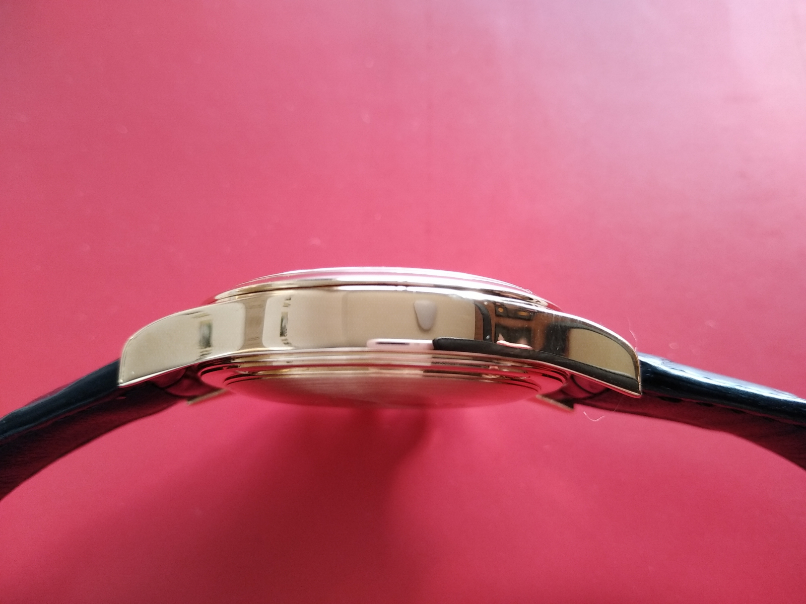 アイボリーの文字盤がとてもきれいな時計です。35mmのケースサイズは腕にしっくり馴染む絶妙な大きさです。付属の黒いベルトは社外品となります。尾錠は18KYGの純正品となります。