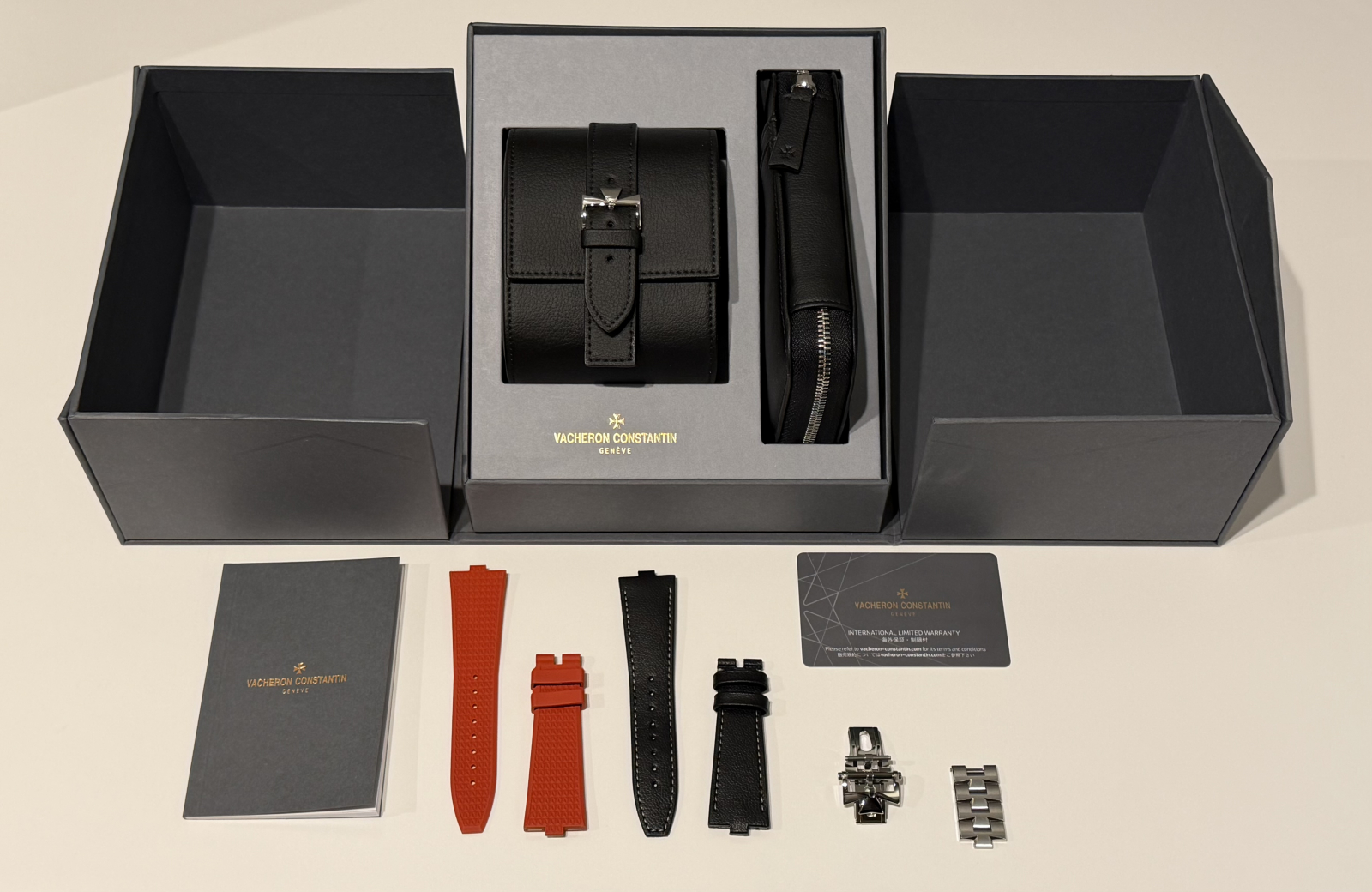 保証書、外箱、専用レザーケース、レザーベルト、ラバーベルト、専用Dバックル、余りコマ、取扱説明書