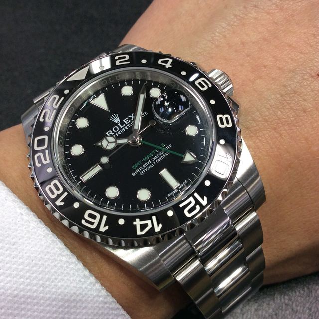 グリーンのGMT針も派手過ぎず程よいアクセントになっていてお洒落です。青黒ベゼルももちろんカッコいいですが、使い勝手が良いのは黒ベゼルかなと個人的には思います。
