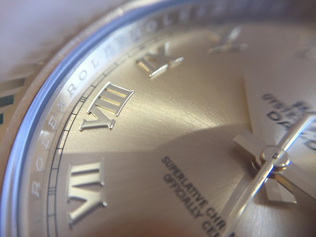 旧型に比べ、デイデイト2のフルーテットベゼルはより肉厚になっている印象だ。